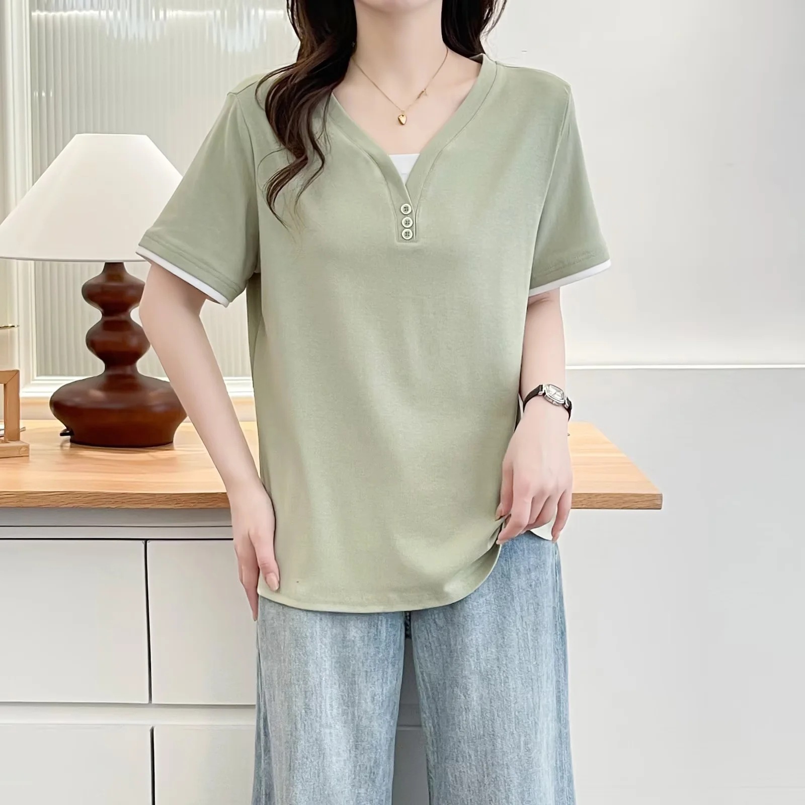 Главная страница > 2025 Весна Новинка Женская мода больших размеров с v-образным вырезом, однотонная футболка с обычными плечами, имитация двух частей, с короткими рукавами H682543.