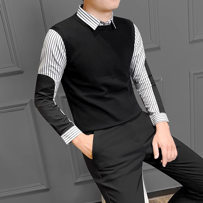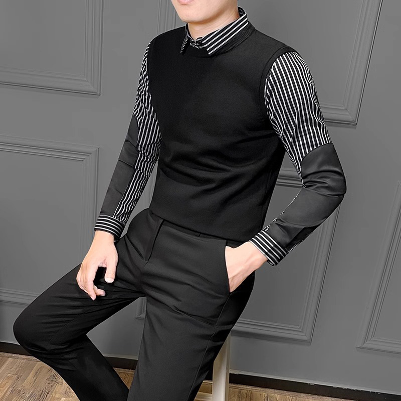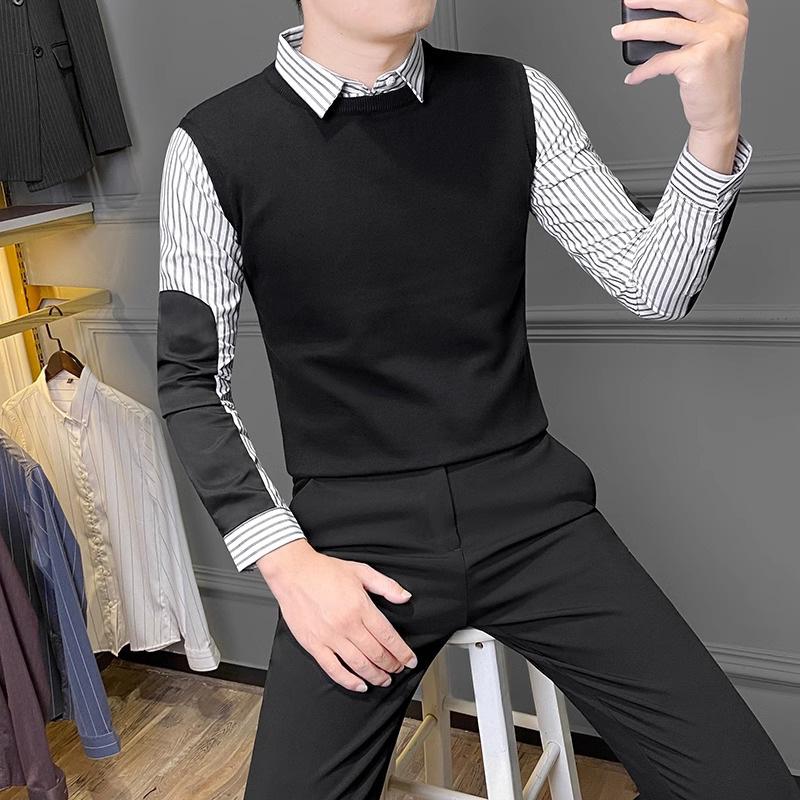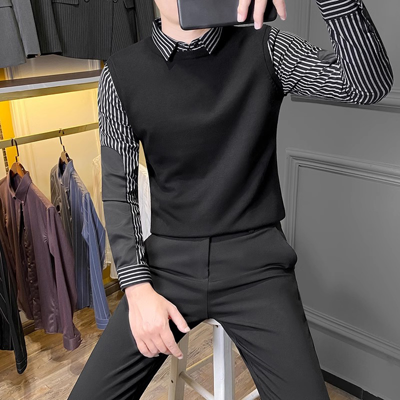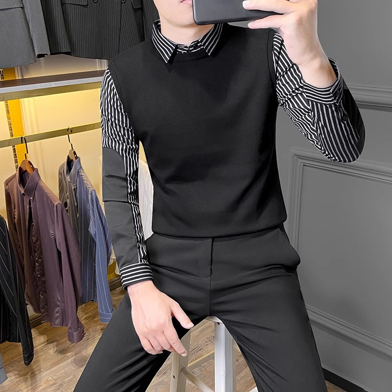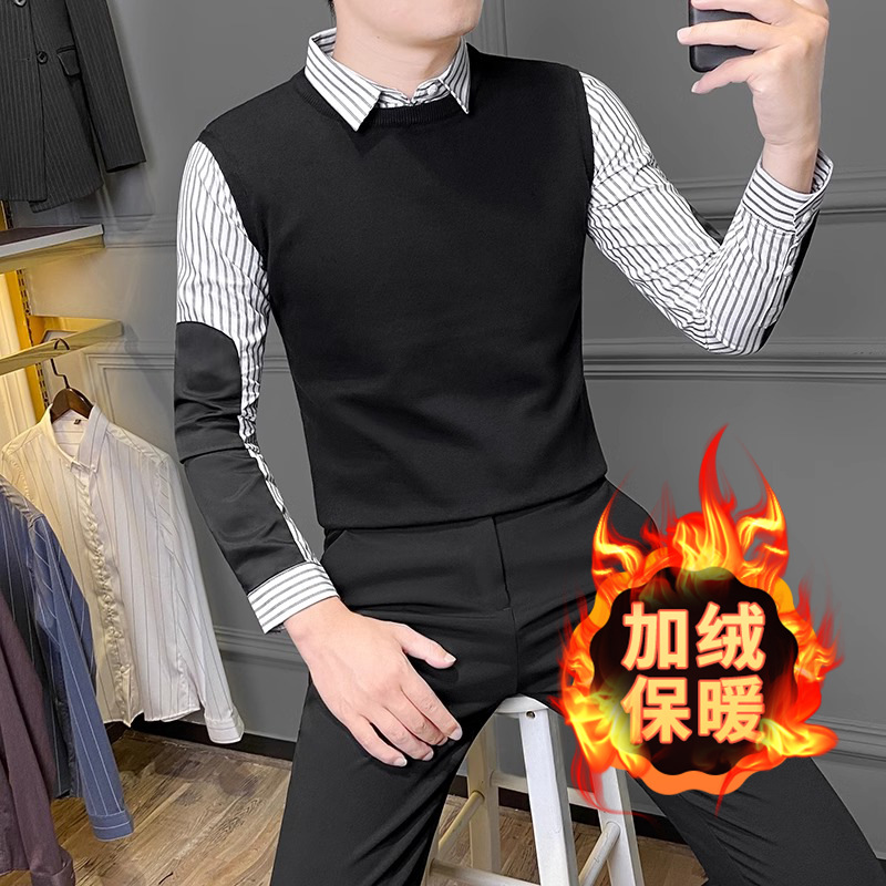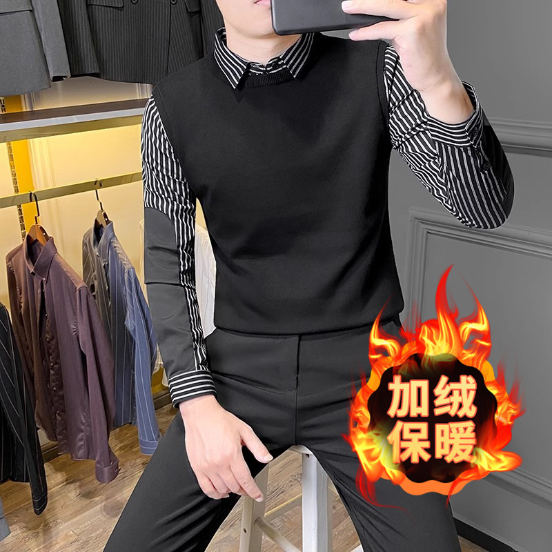 Главная страница > Легкий роскошный воротник рубашки, искусственный свитер из двух частей, мужская модная повседневная рабочая одежда, осенне-зимняя полосатая рубашка с длинными рукавами и внутренним слоем