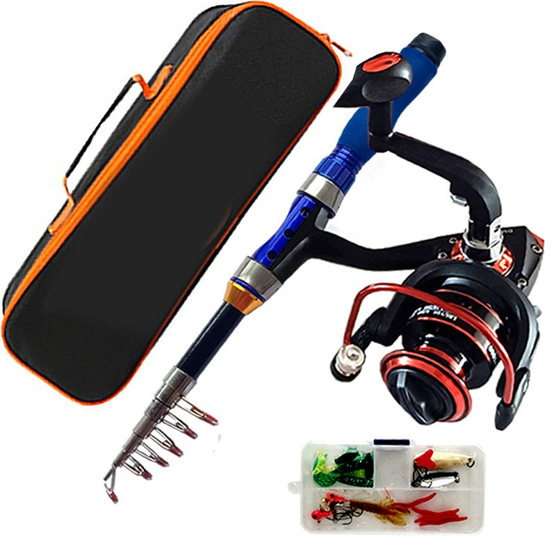 Телескопическая синяя короткая удочка + металлическое катушечное колесо + 20 аксессуаров + сумка