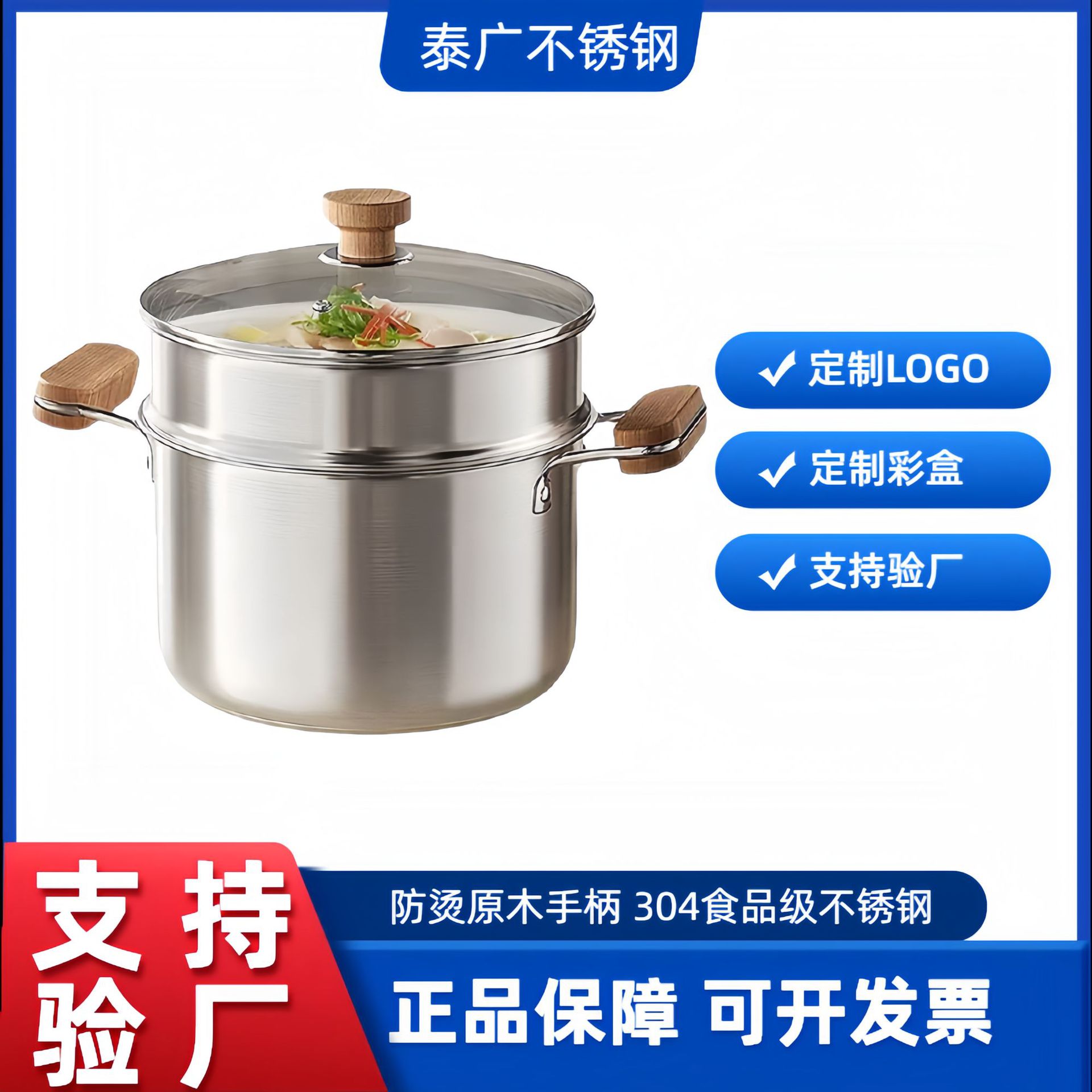 Завод-изготовитель предлагает кастрюли для супа из пищевой нержавеющей стали 304 с двойным дном, утолщенные, с возможностью нанесения лазерного логотипа на счет.
