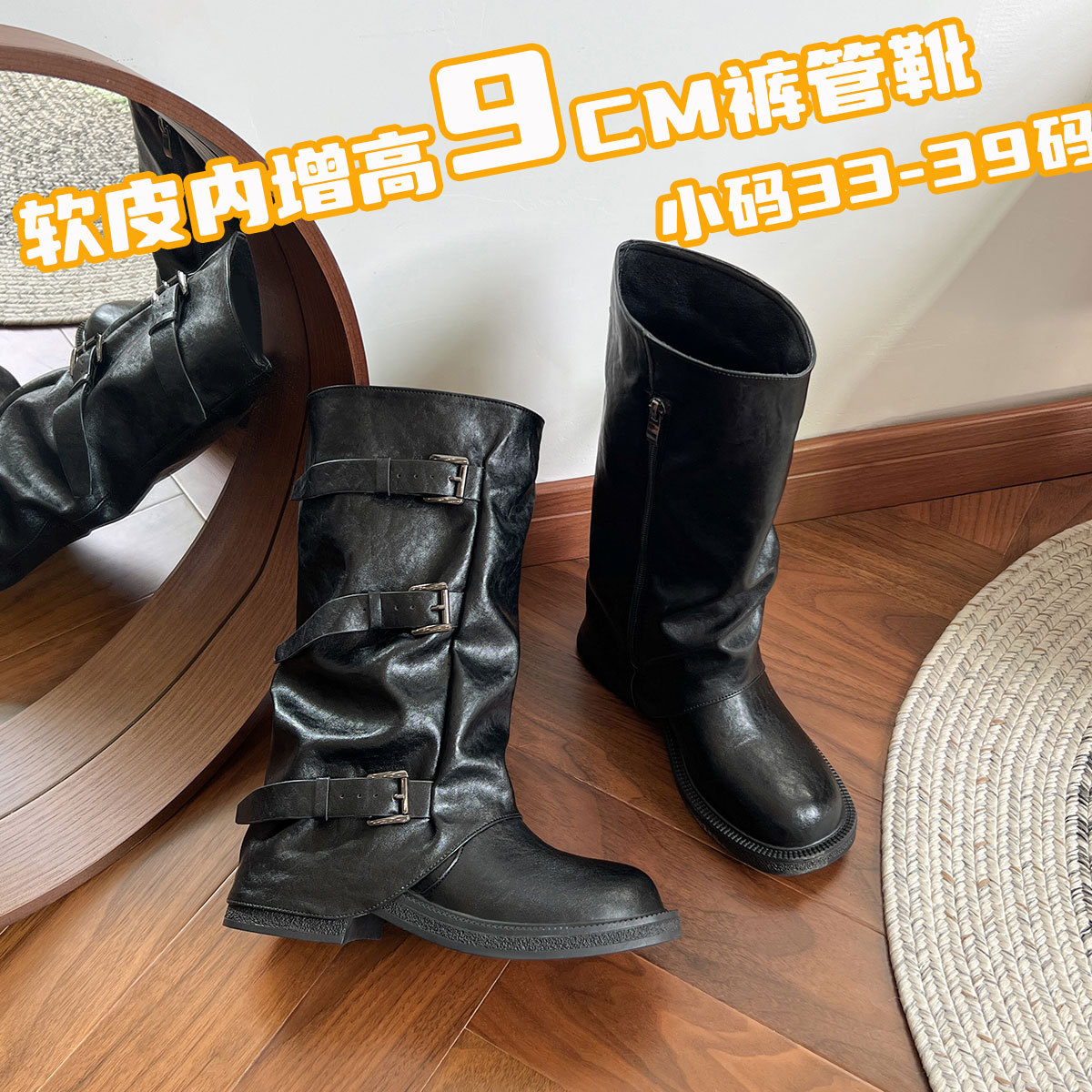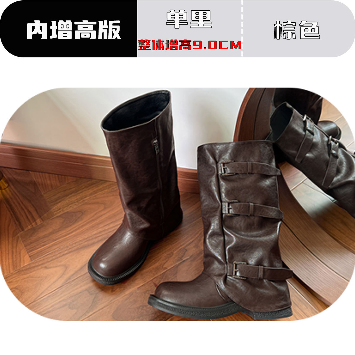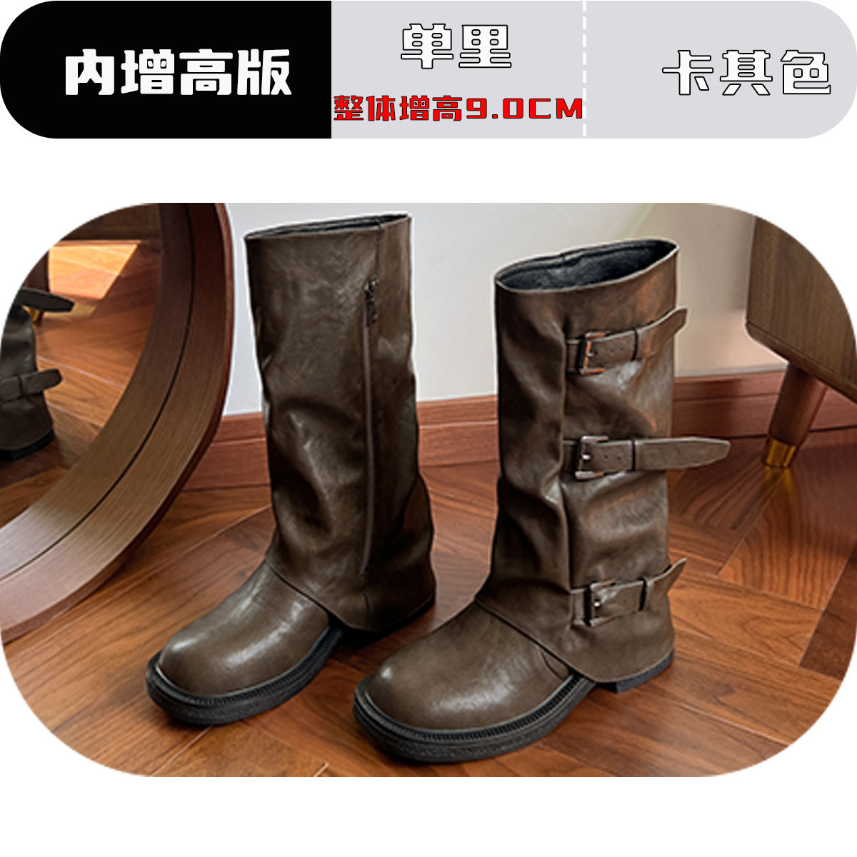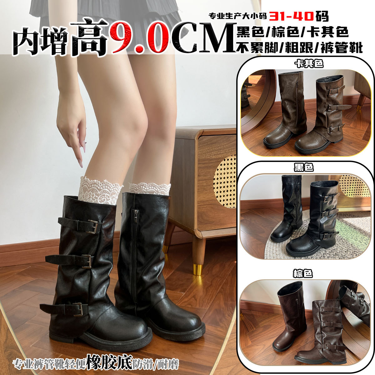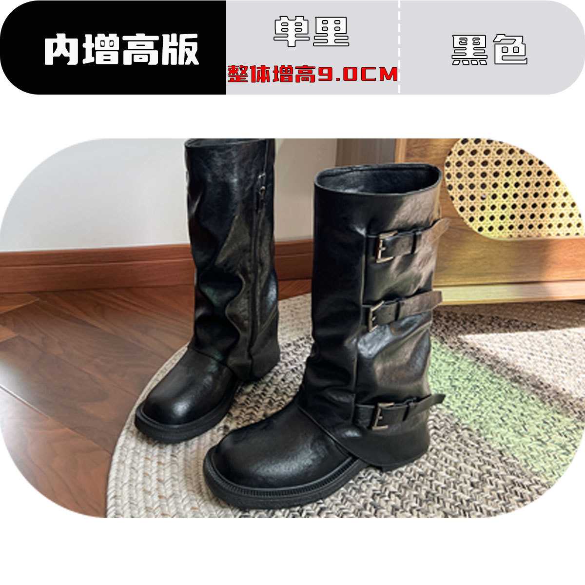 Черные женские ботинки с высокой посадкой и внутренним увеличением роста, европейский и американский стиль, уличная мода, круглый носок, массивный каблук, пряжка ремня, высокие сапоги до колена, плиссированные высокие сапоги для верховой езды.