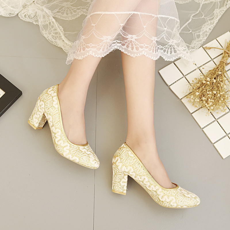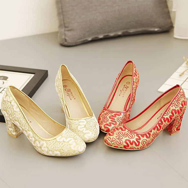 2AD13 круглая голова толстый каблук высокие каблуки китайские кружева свадебные туфли банкет Cheongsam обувь с низким верхом Женская обувь оптом