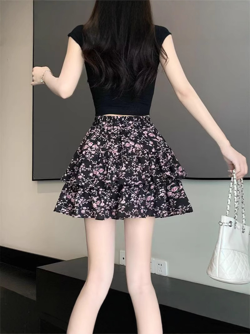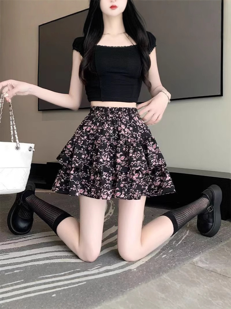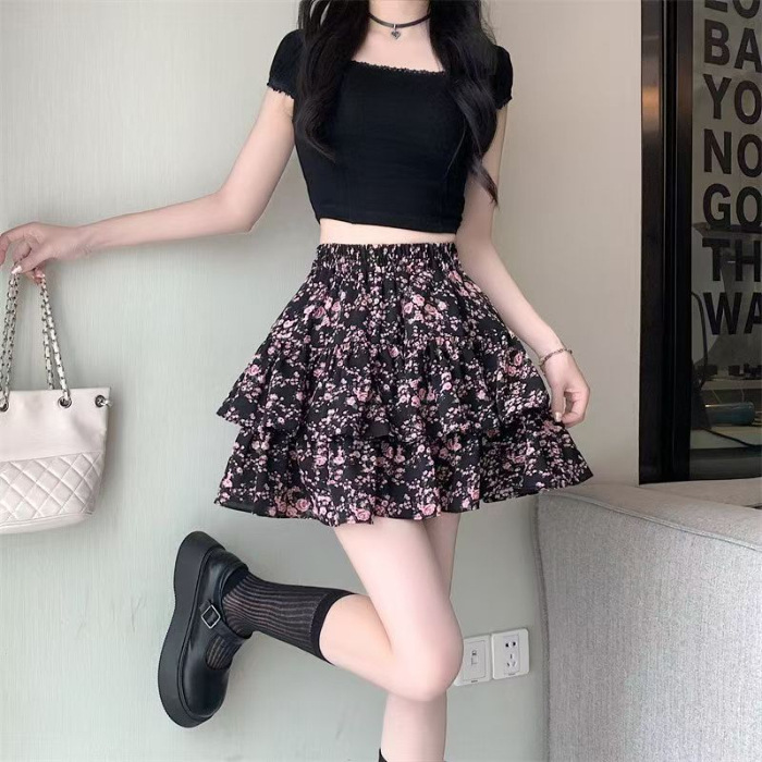 Юбка-пирожное с цветочным принтом, женская новинка 2025 года, летняя балетная юбка-трапеция с рюшами и пышными рукавами для похудения