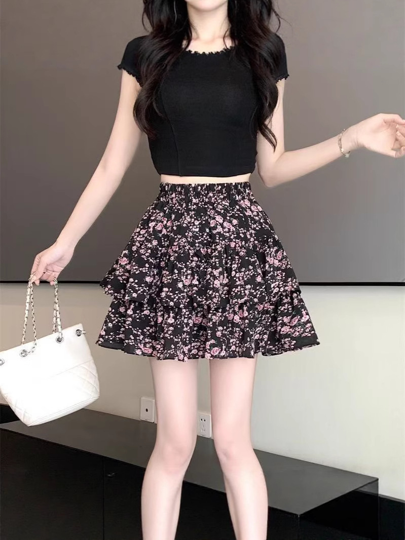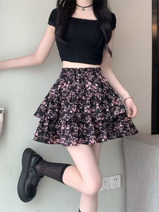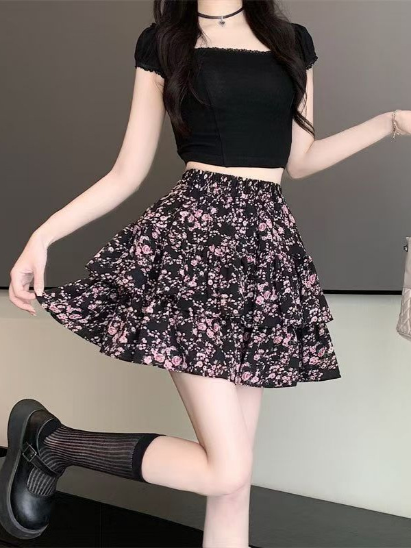 Главная страница > Юбка-пирожное с цветочным принтом, женская новинка 2025 года, летняя балетная юбка-трапеция с рюшами и пышными рукавами для похудения