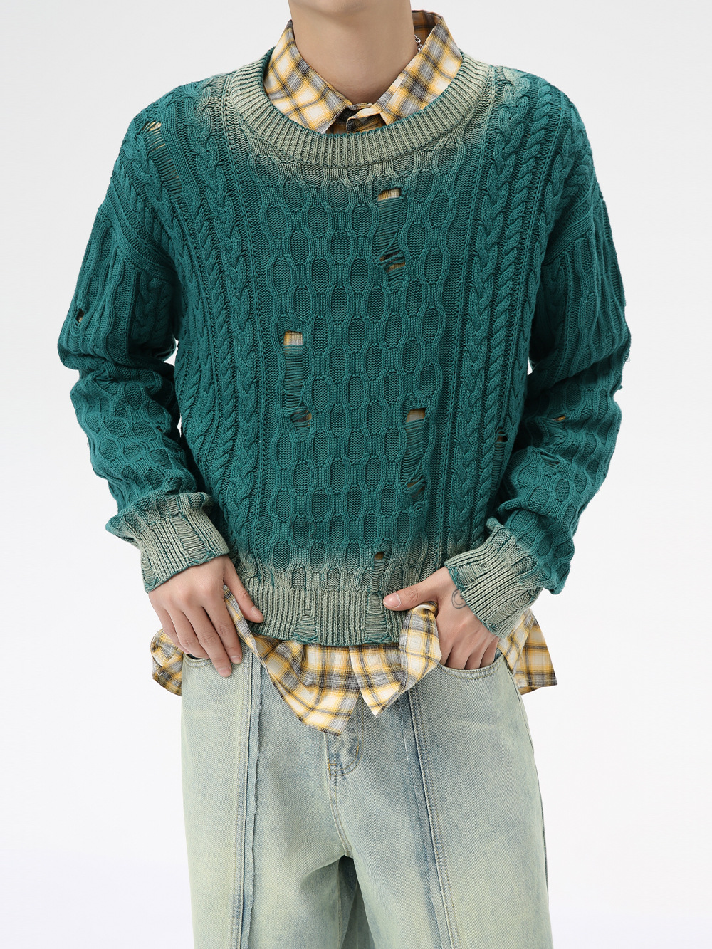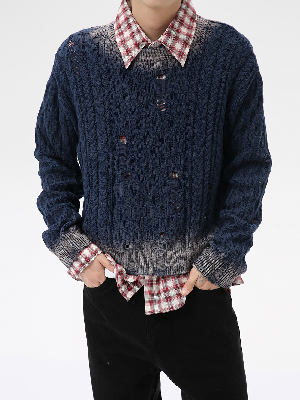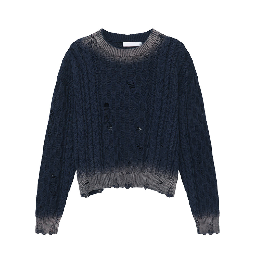 Главная страница > Мужская одежда MTLCLOTHES | Модный корейский стиль: высококачественный персонализированный ретро-свитер с ажурной вязкой, градиентной расцветкой и эффектом рваности.