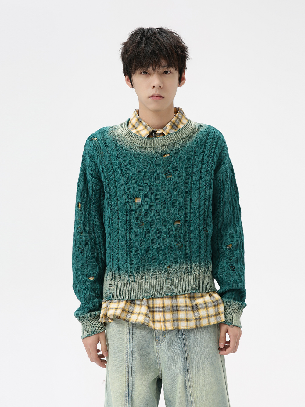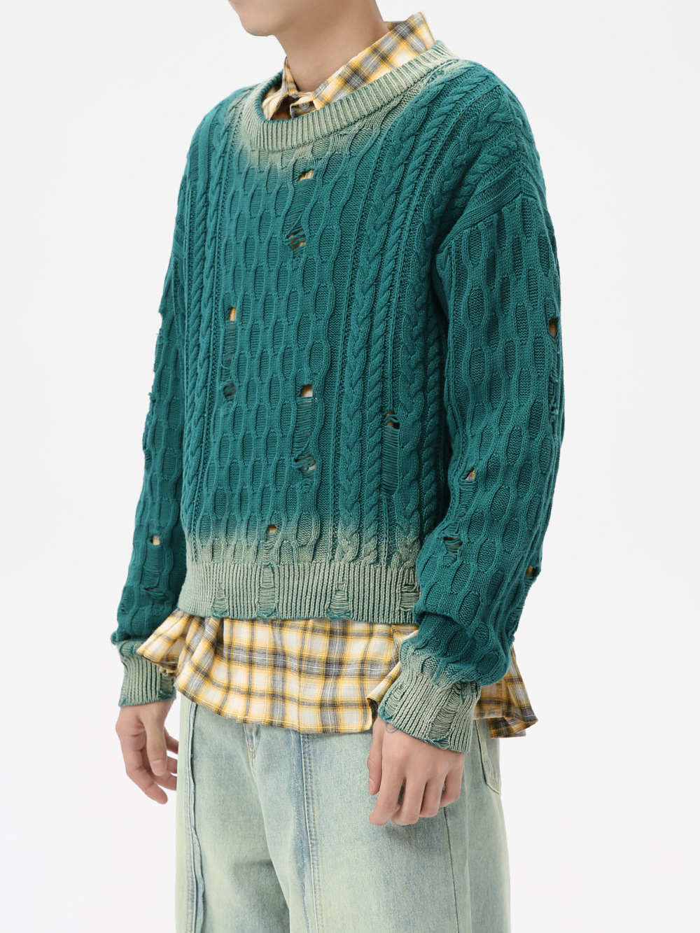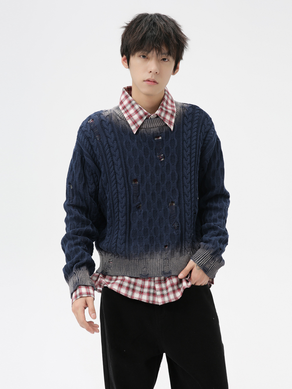 Главная страница > Мужская одежда MTLCLOTHES | Модный корейский стиль: высококачественный персонализированный ретро-свитер с ажурной вязкой, градиентной расцветкой и эффектом рваности.