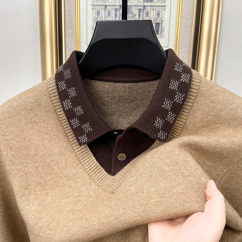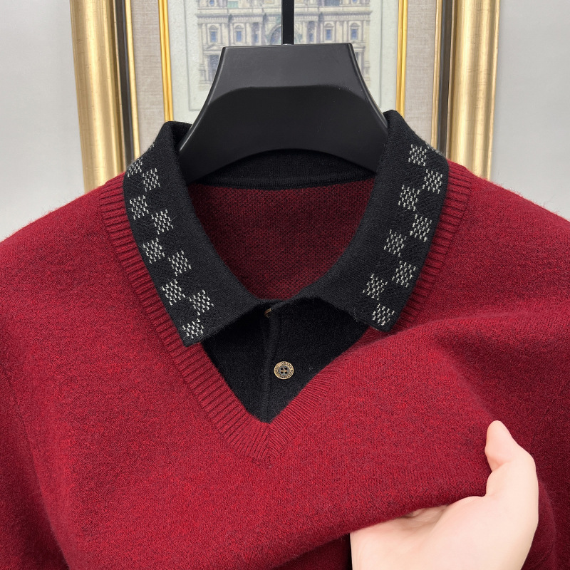 2024 весна и осень новый поддельный два сплошного цвета сшитый свитер рубашка воротник пуловер модная повседневная нижняя рубашка мужская одежда