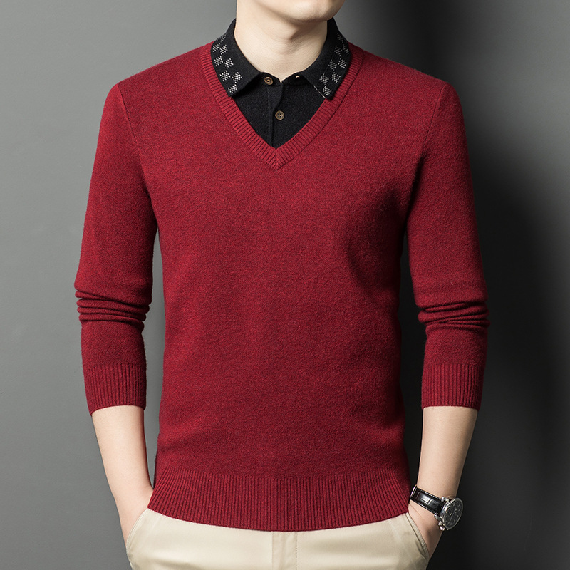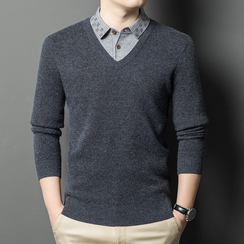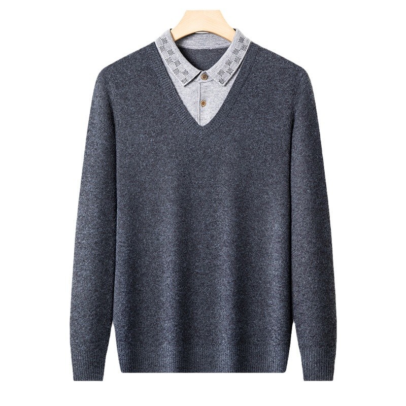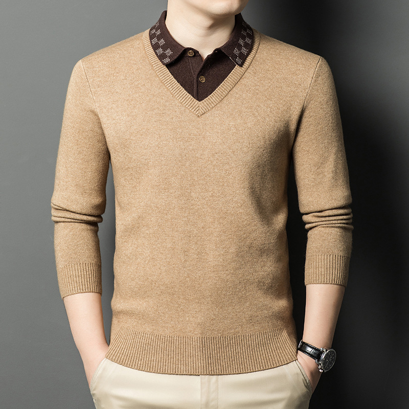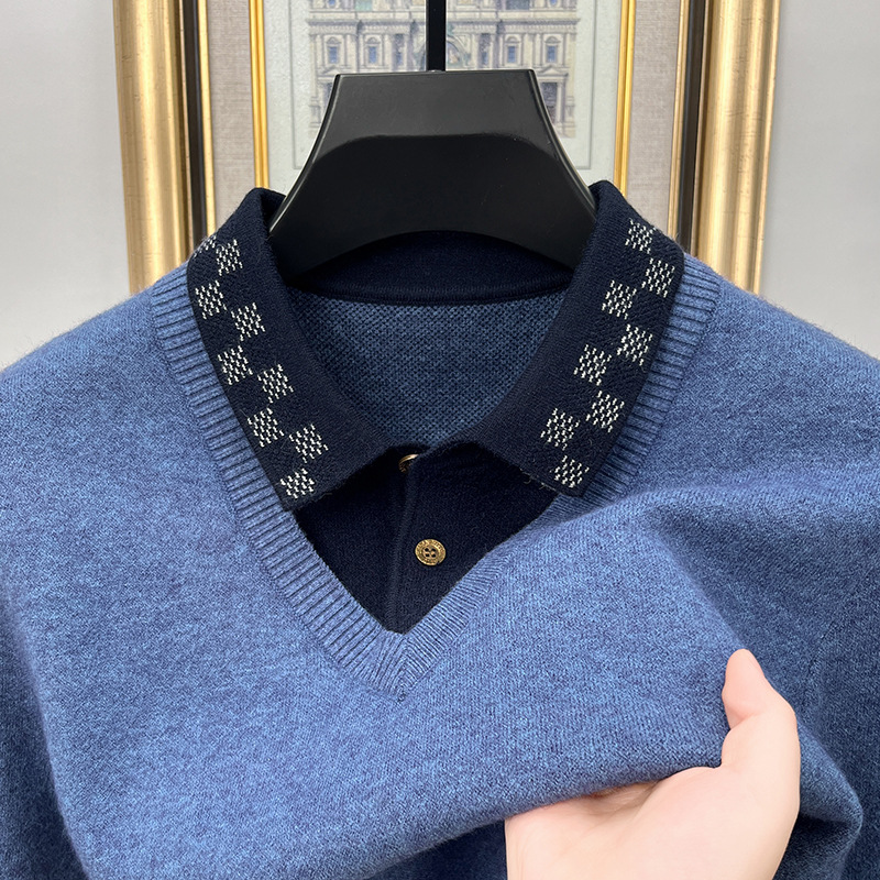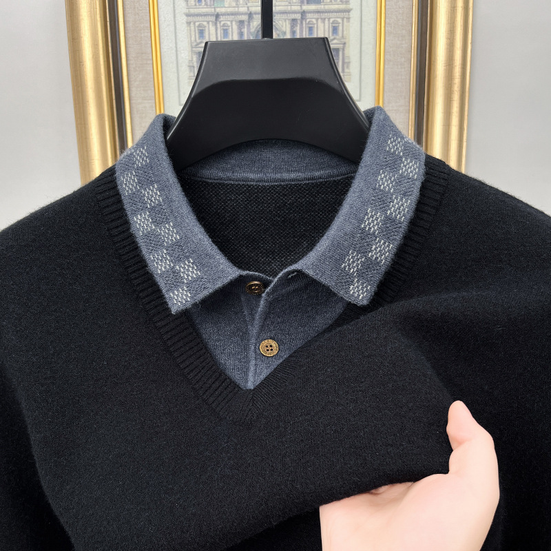 Главная страница > 2024 весна и осень новый поддельный два сплошного цвета сшитый свитер рубашка воротник пуловер модная повседневная нижняя рубашка мужская одежда