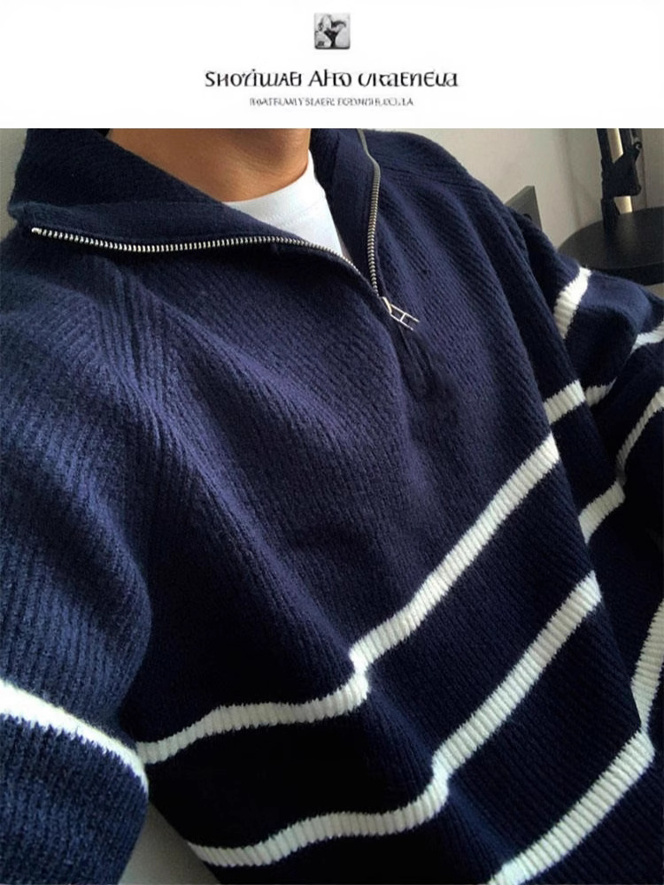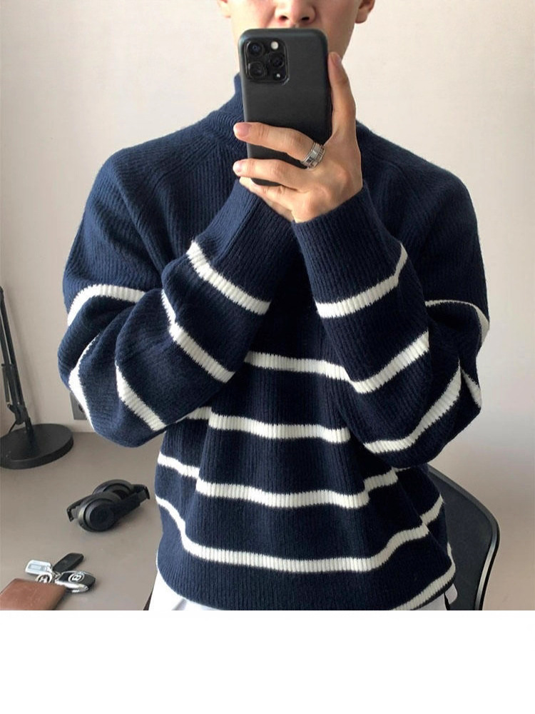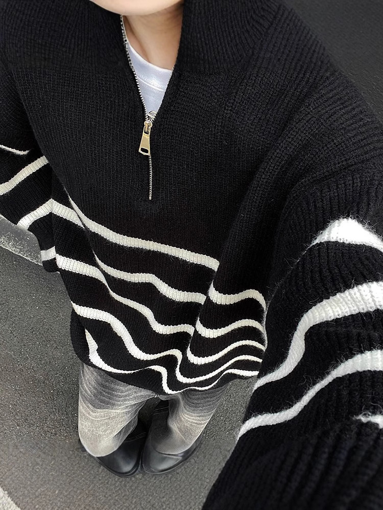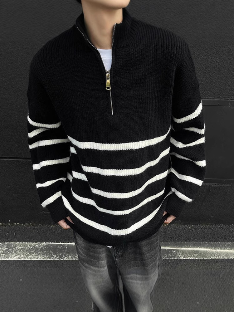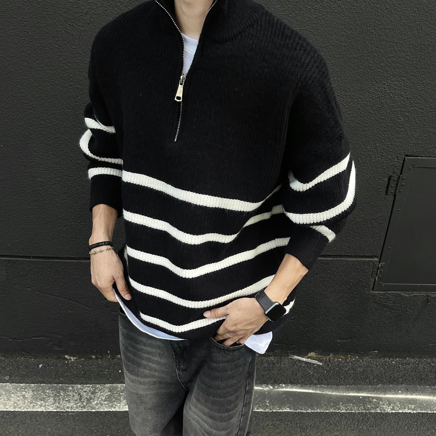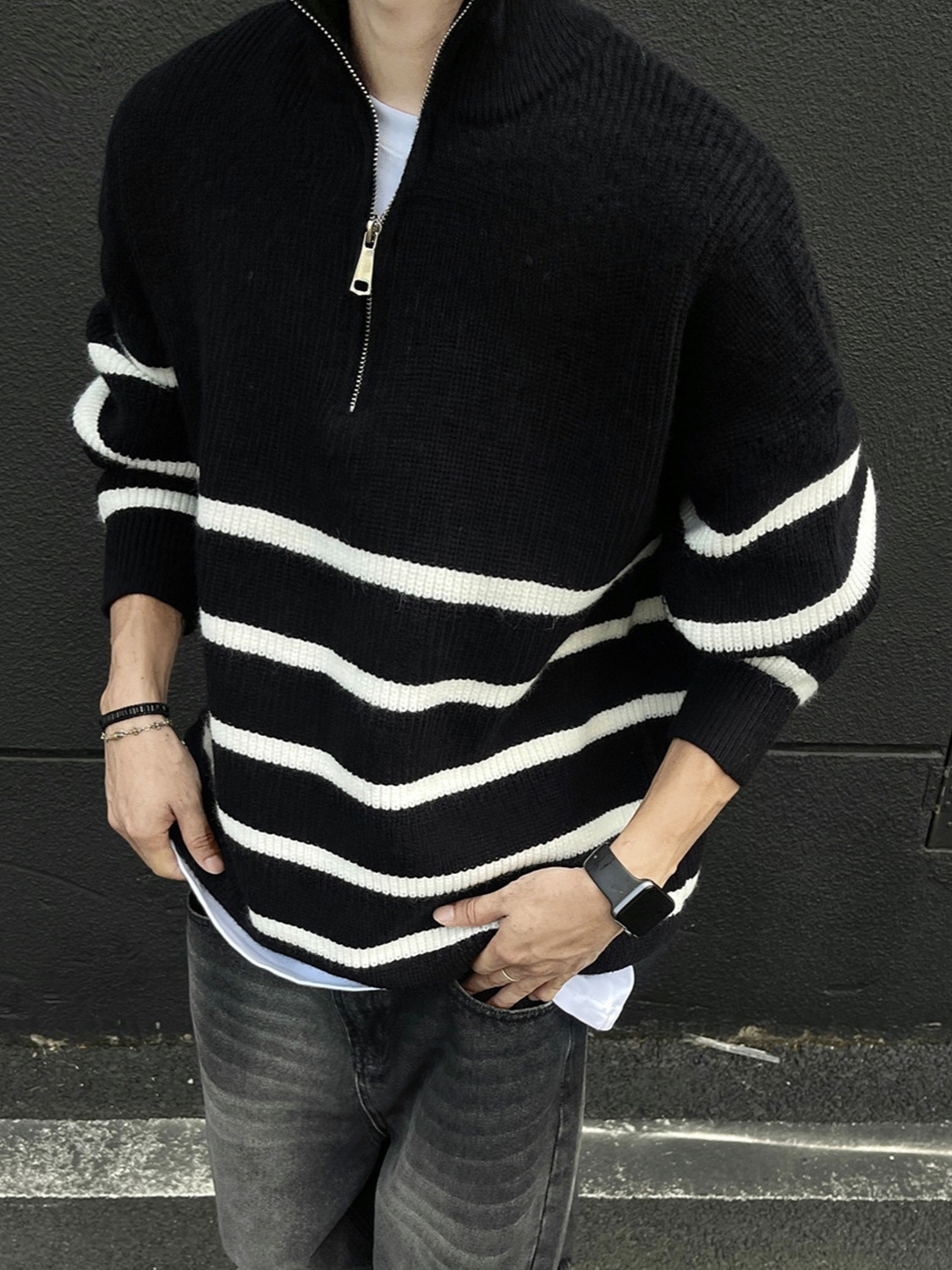 Главная страница > Полосатый свитер с половиной молнии, мужской воротник-стойка, осенне-зимний новый стиль, ленивый высококачественный свободный пуловер, трикотажная куртка
