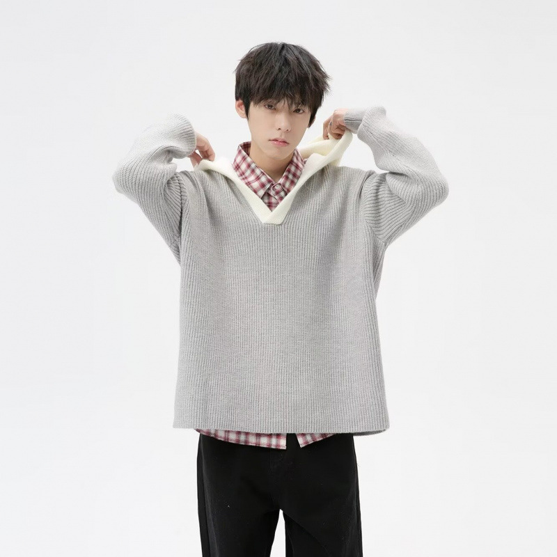 Главная страница > 2024 Осенний корейский стиль с мягким восковым трикотажом с капюшоном мужской повседневный прилив V-образный толстовка с капюшоном свитер мужской