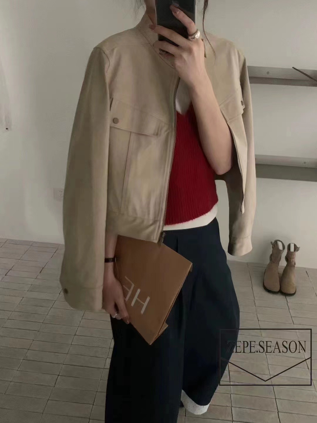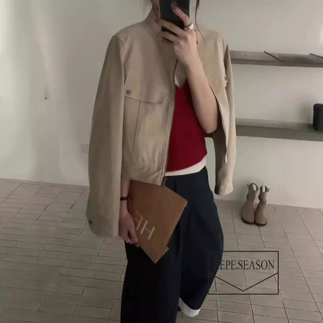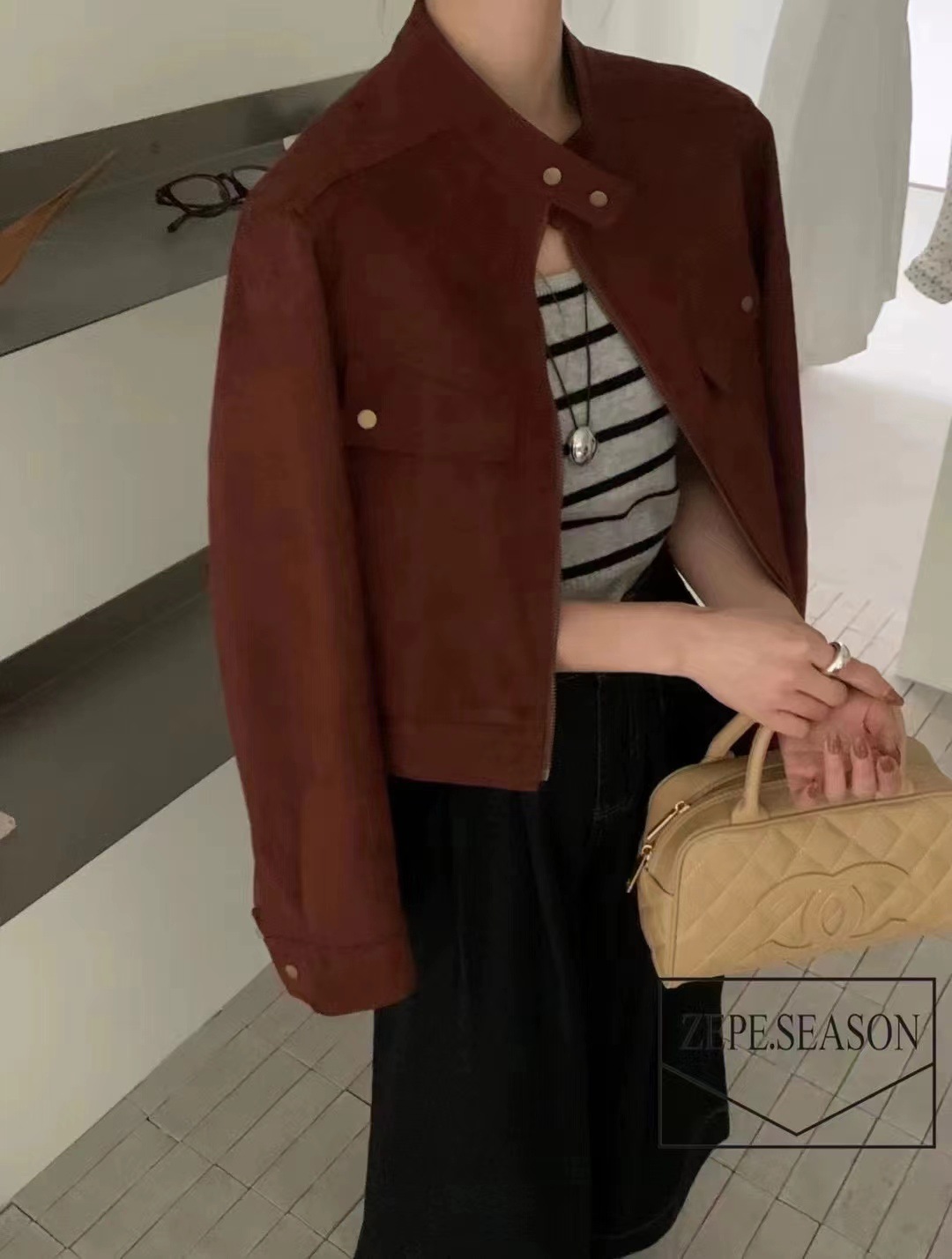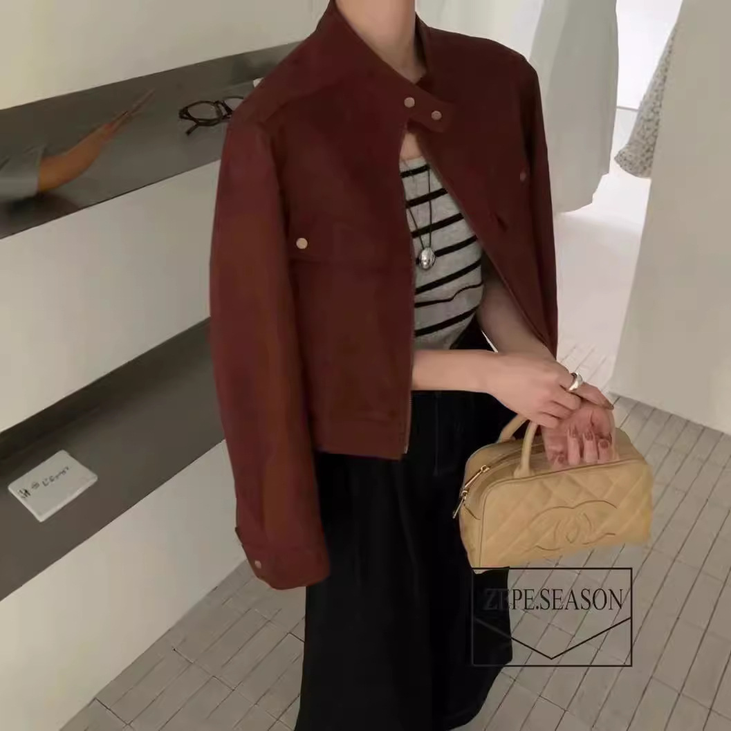 Главная страница > Замшевая куртка для женщин, укороченная модель, цвет ангора-красный, новинка осени 2024, винтажный стиль, корейский ретро-стиль.