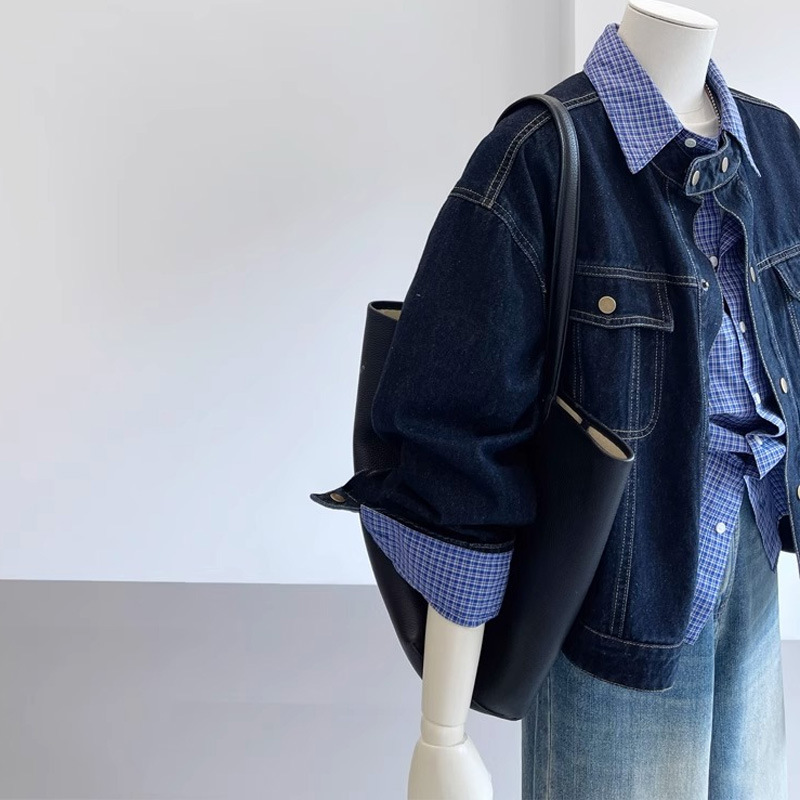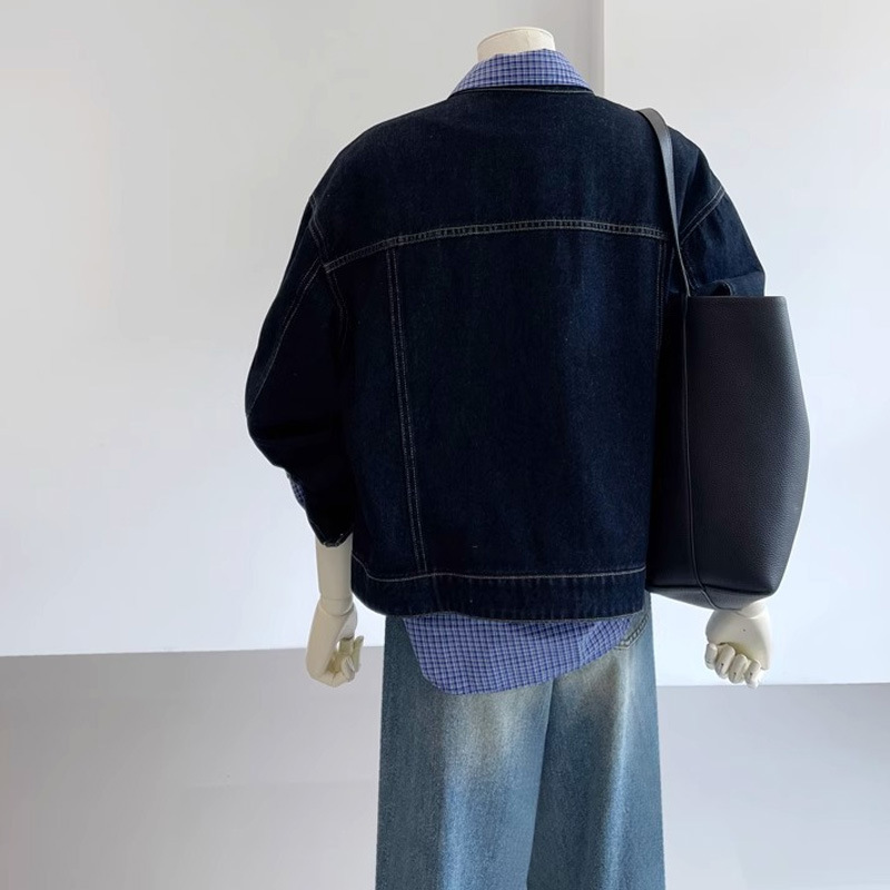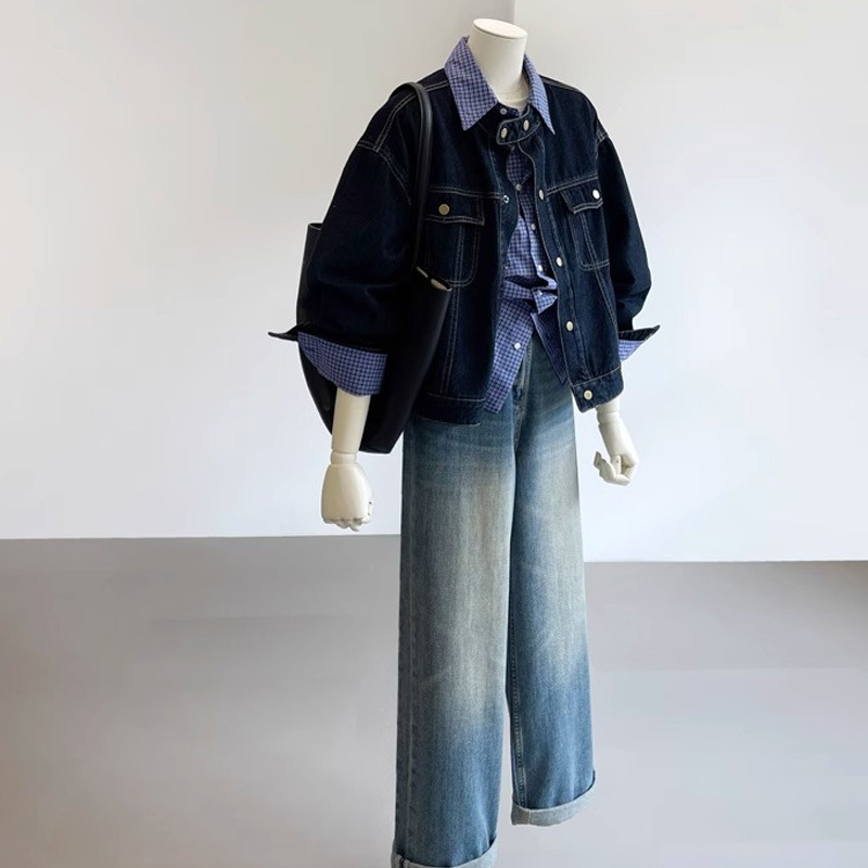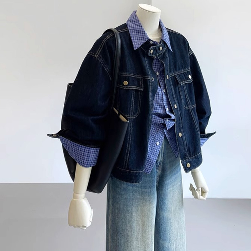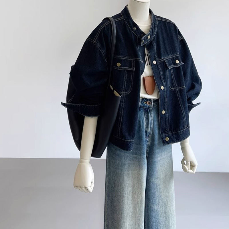 Главная страница > Ретро модный темно-синий джинсовый пиджак женский 2024 осень новый маленький воротник свободный однобортный повседневный пиджак