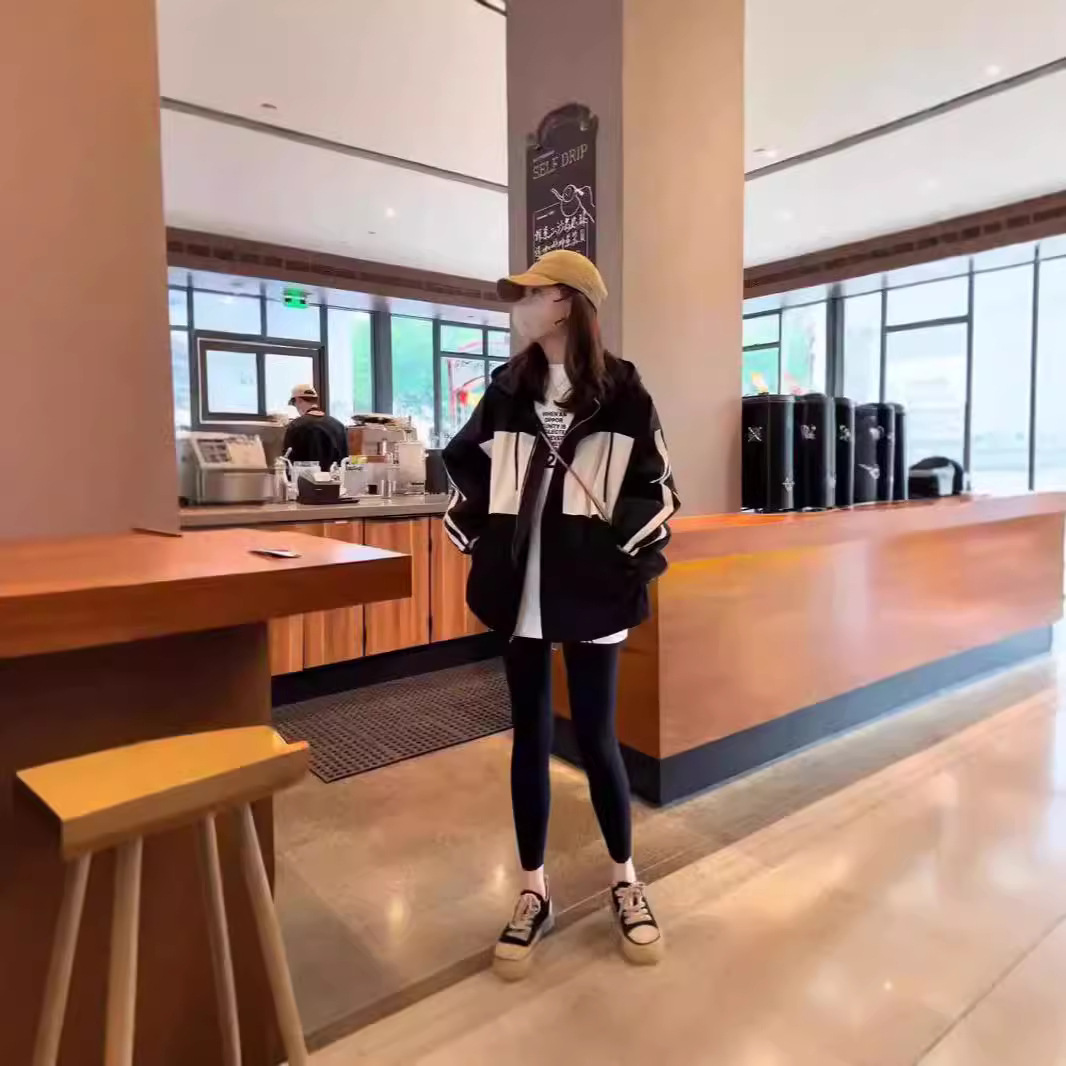 Женская ветровка с цветовыми блоками, весна-осень 2024, универсальная спортивная куртка в корейском стиле для миниатюрных женщин, повседневный топ с длинным рукавом.