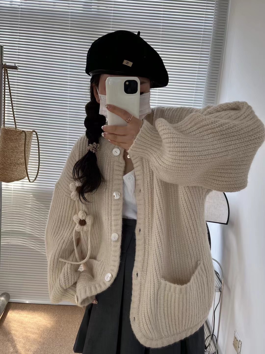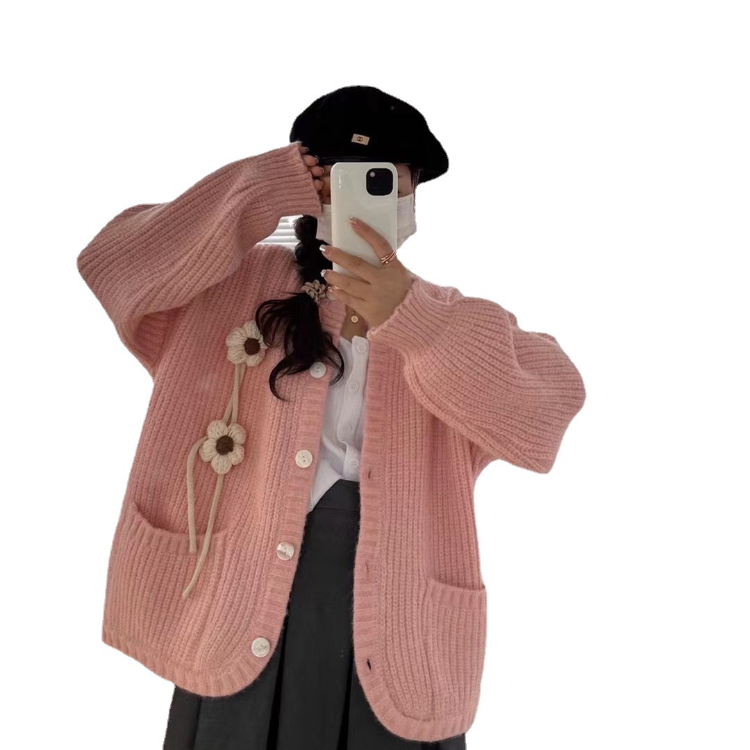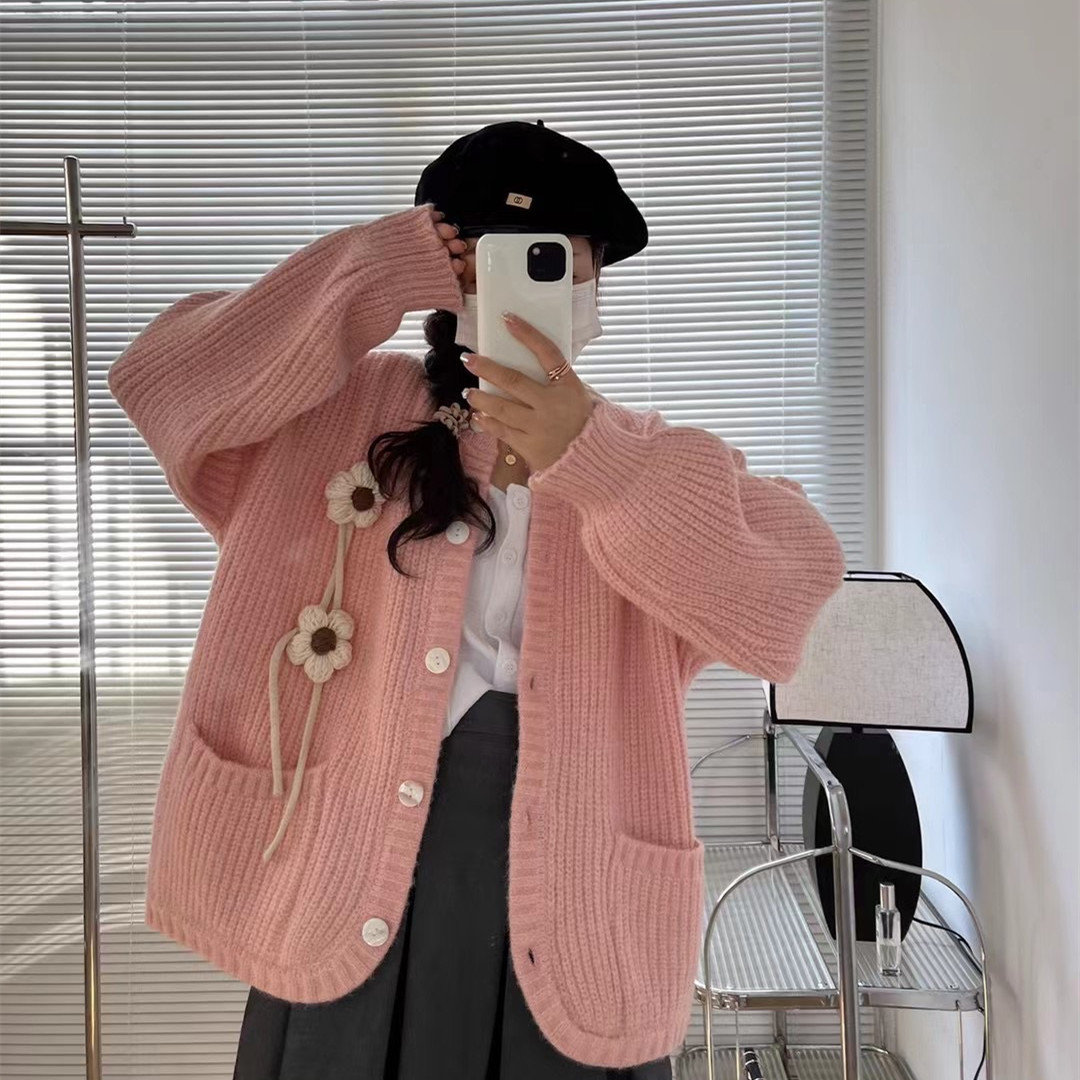 Главная страница > Сладкий Свободный вязаный кардиган средней длины в ленивом стиле, Женская осенне-зимняя Новая трехмерная куртка-свитер с маленьким цветком 2022 года для женщин