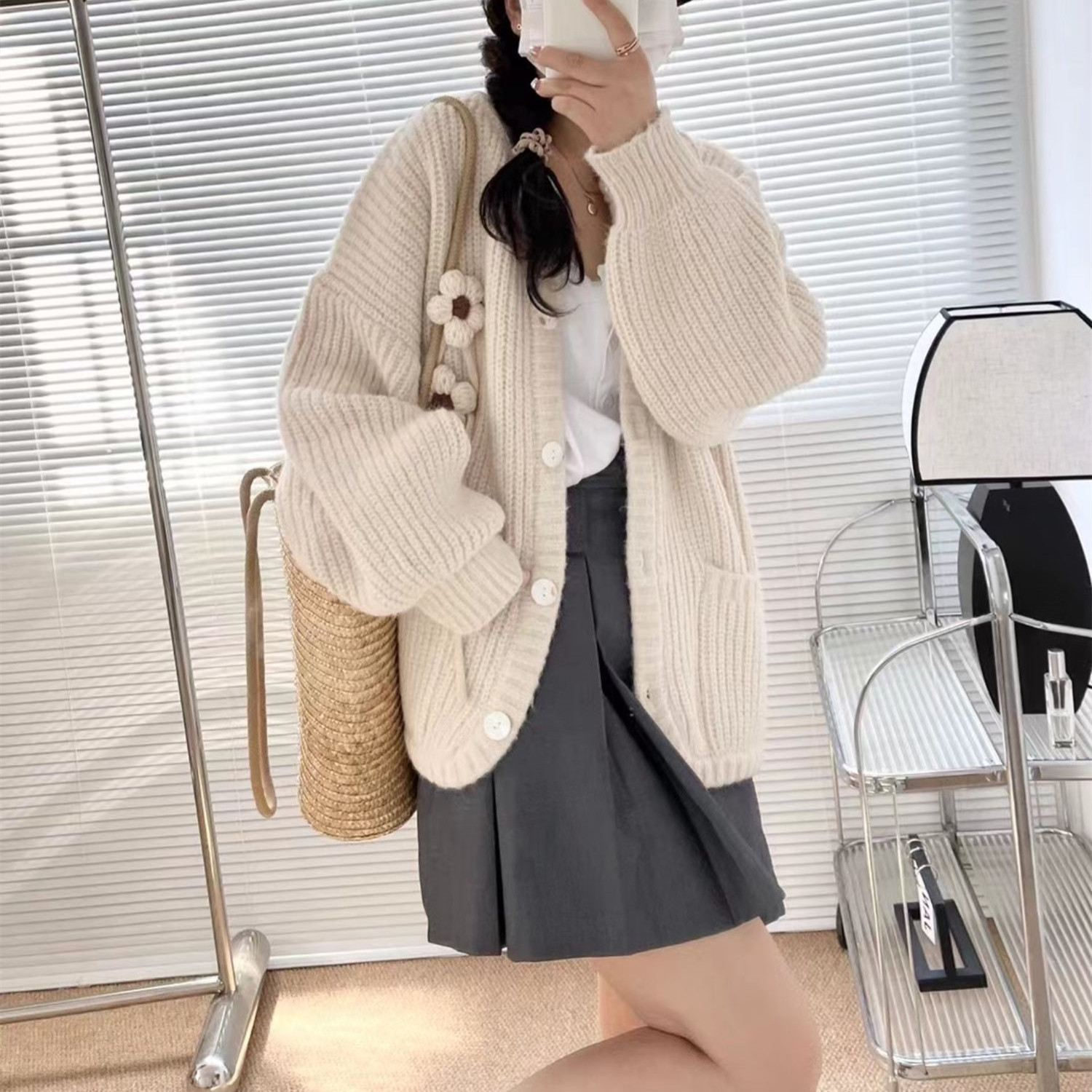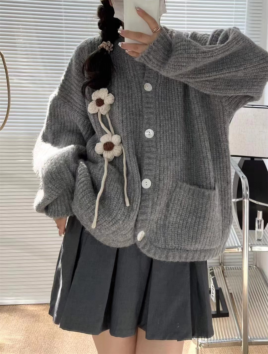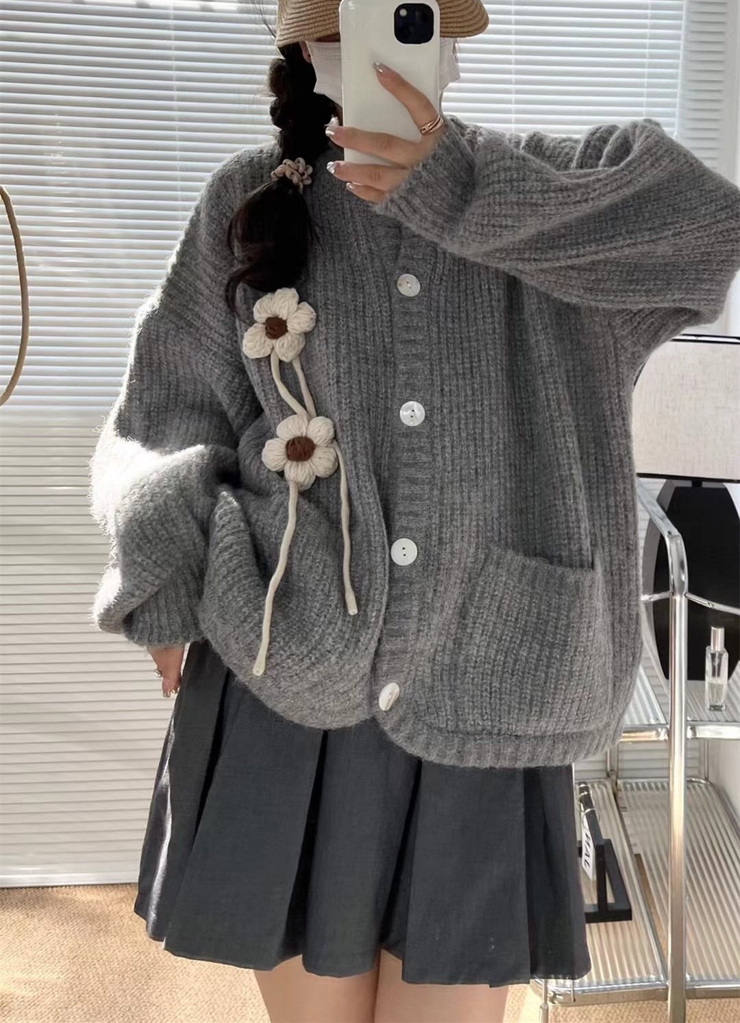 Главная страница > Сладкий Свободный вязаный кардиган средней длины в ленивом стиле, Женская осенне-зимняя Новая трехмерная куртка-свитер с маленьким цветком 2022 года для женщин