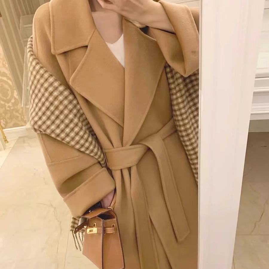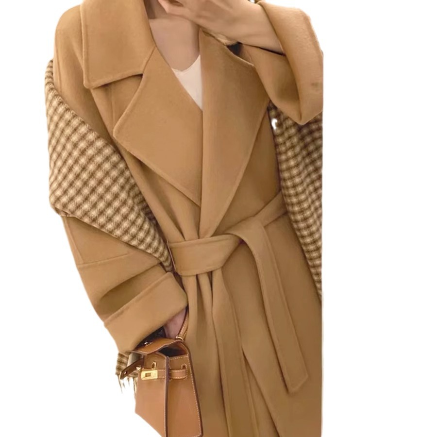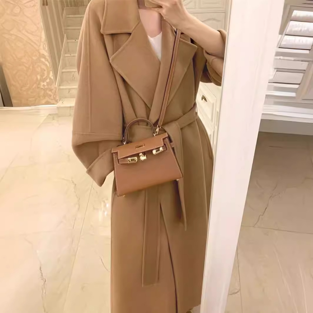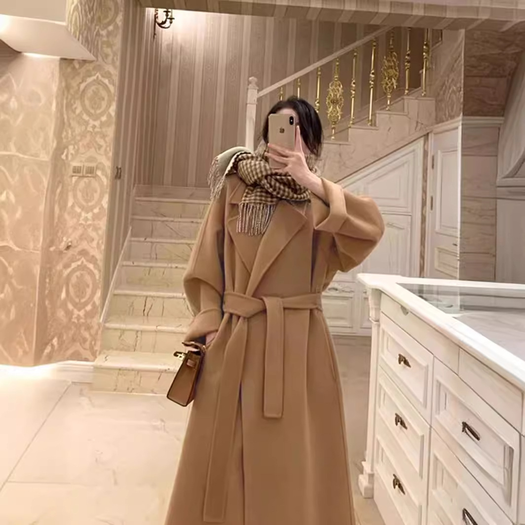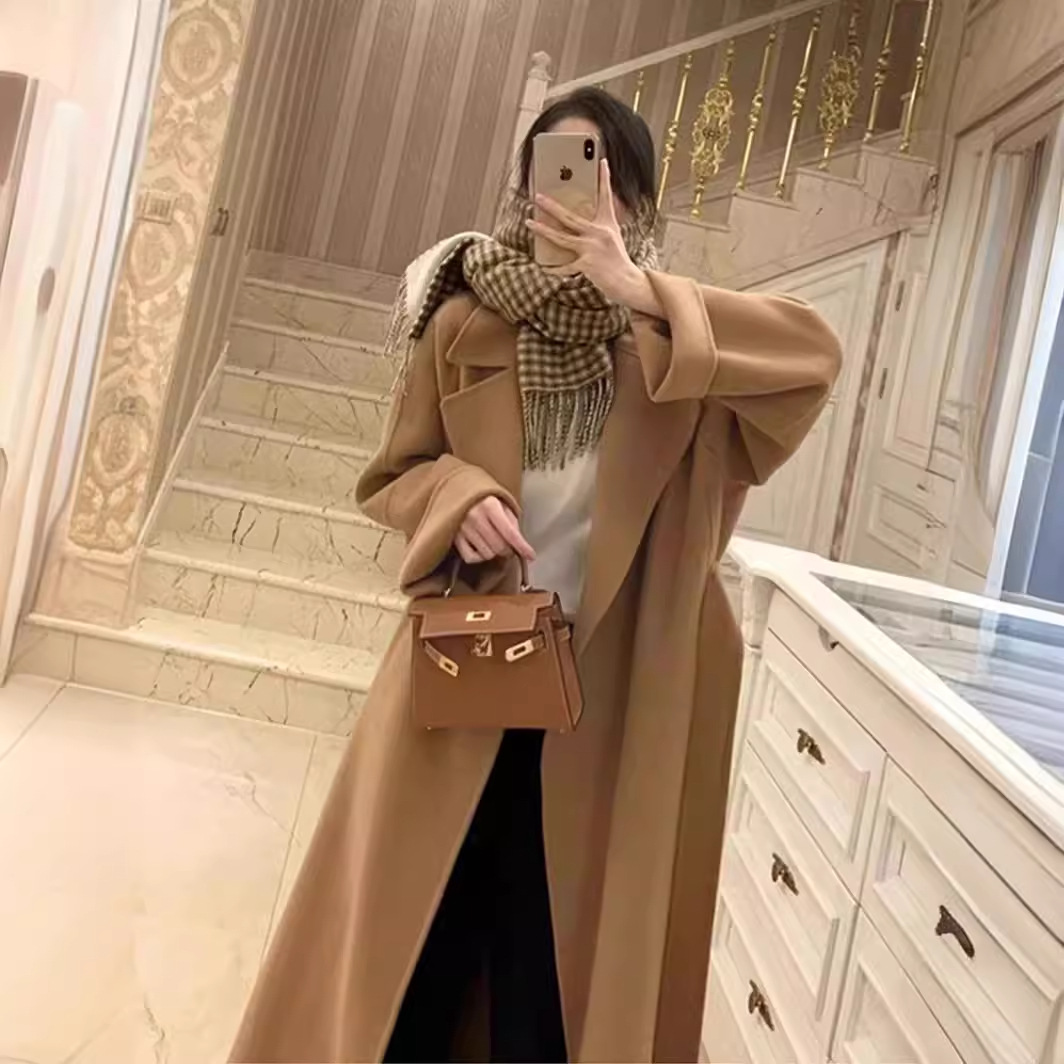 Главная страница > Двустороннее кашемировое пальто цвета верблюжьего песка для женщин, осень-зима 2025, новая модель в стиле Хепберн, элегантное шерстяное пальто средней длины для женщин