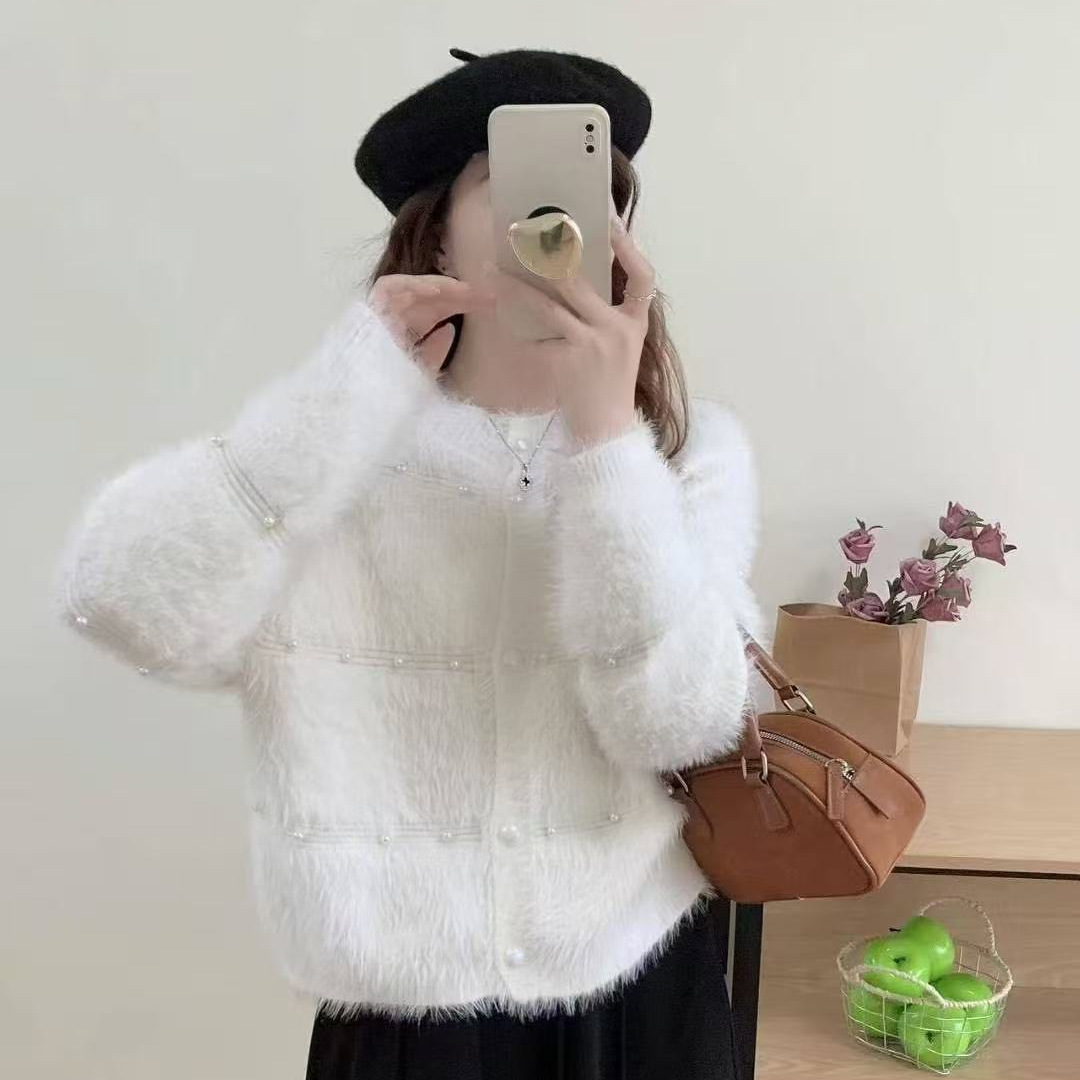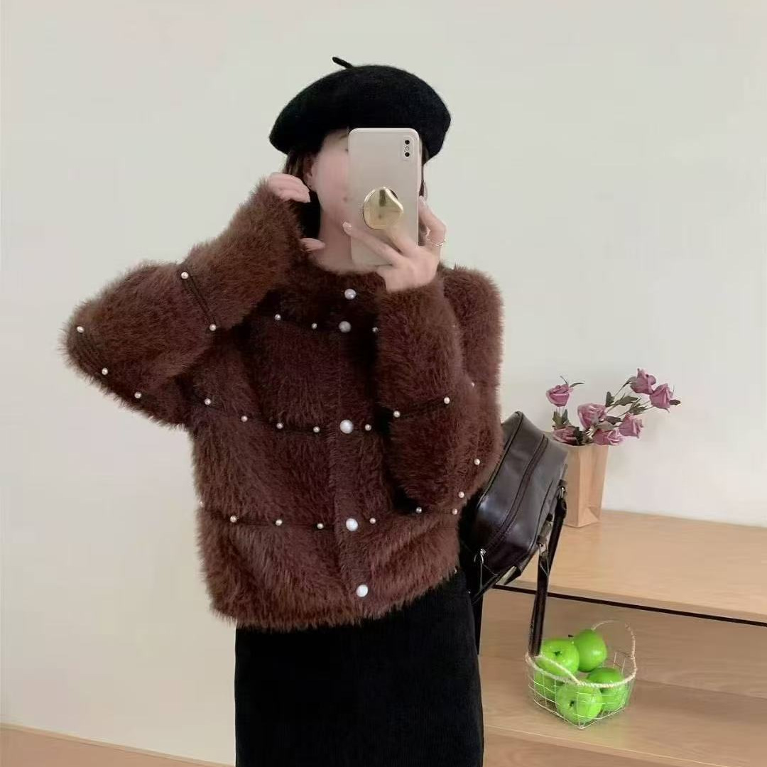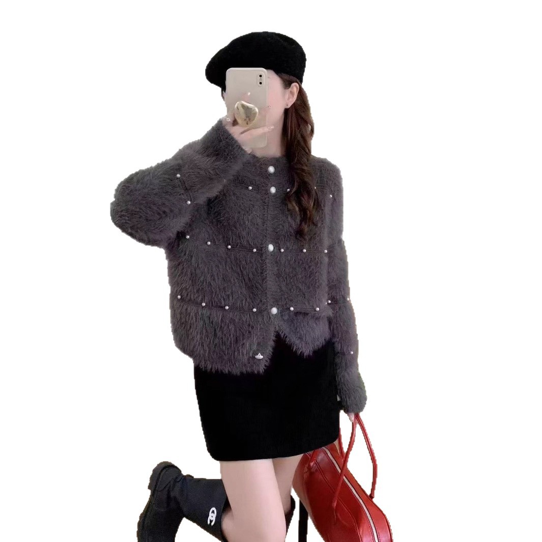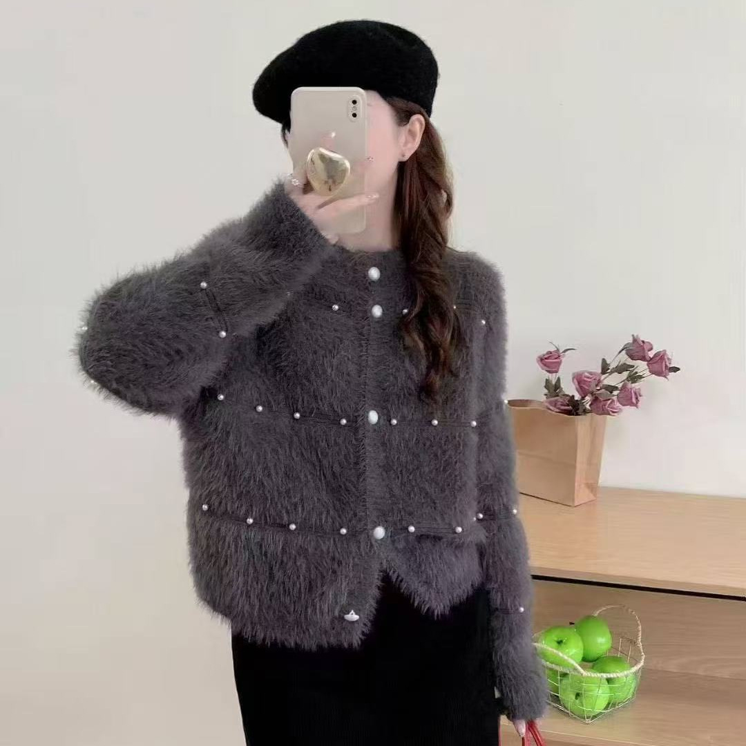 Твидовый вязаный кардиган для женщин, осень-зима 2025, новый свободный свитер с V-образным вырезом, украшенный бисером, имитация норковой куртки