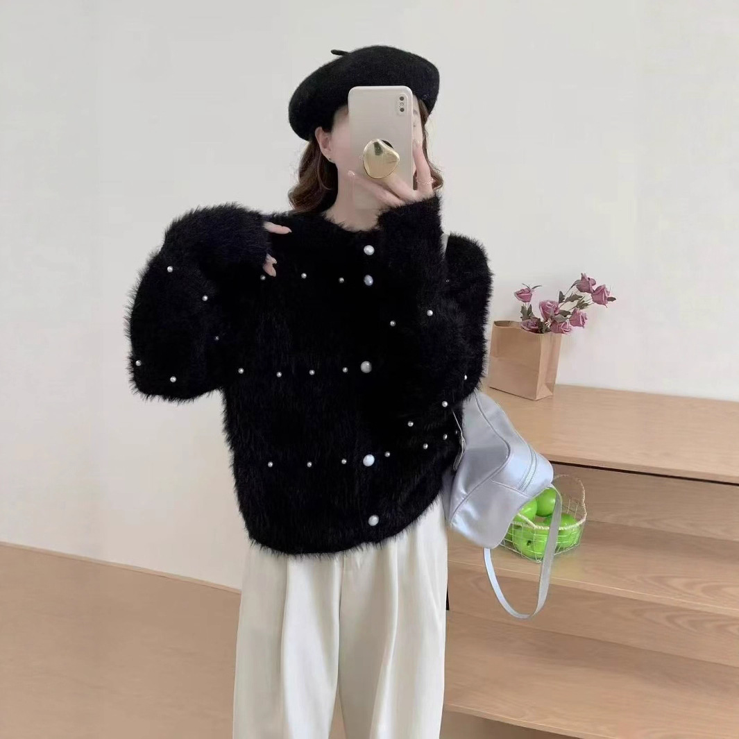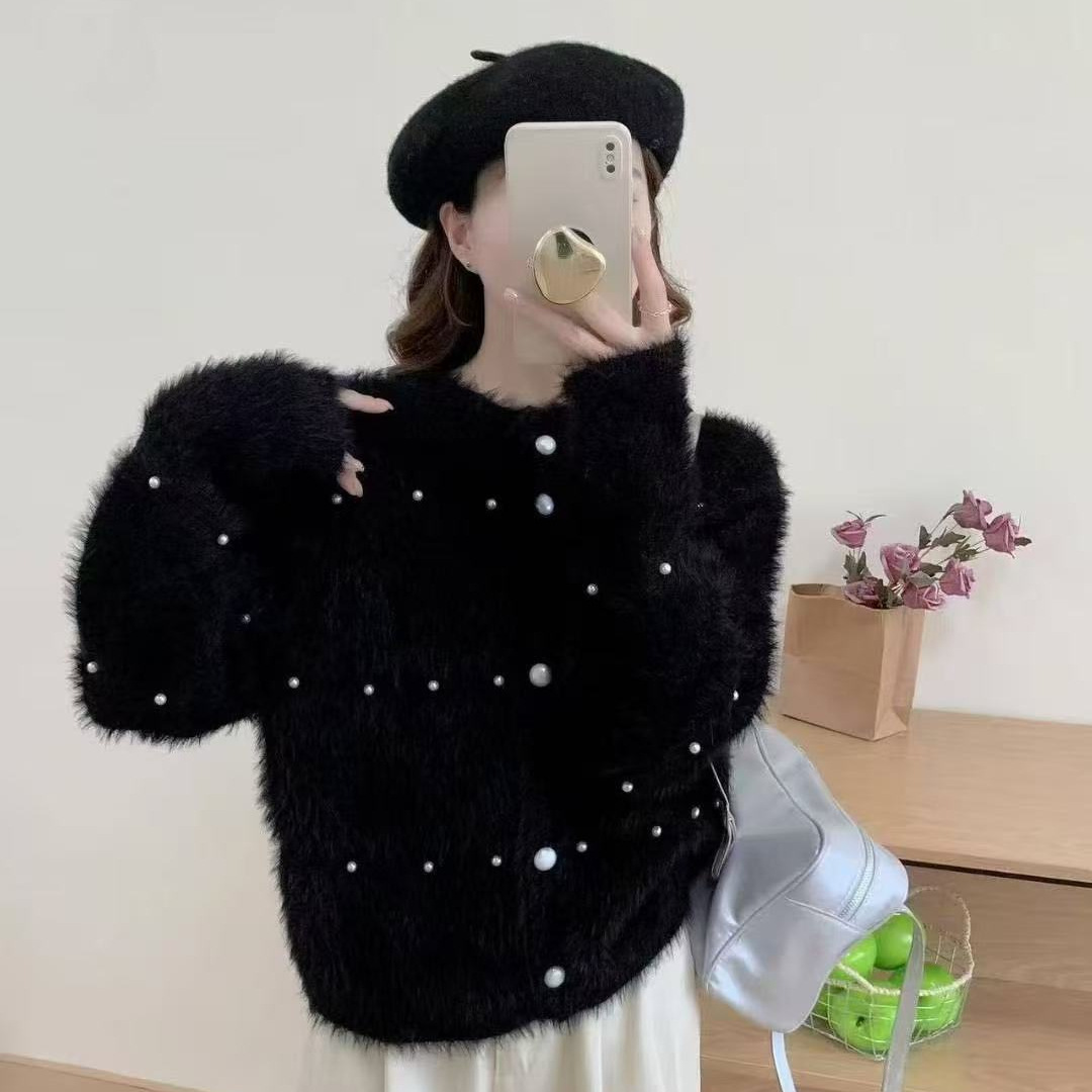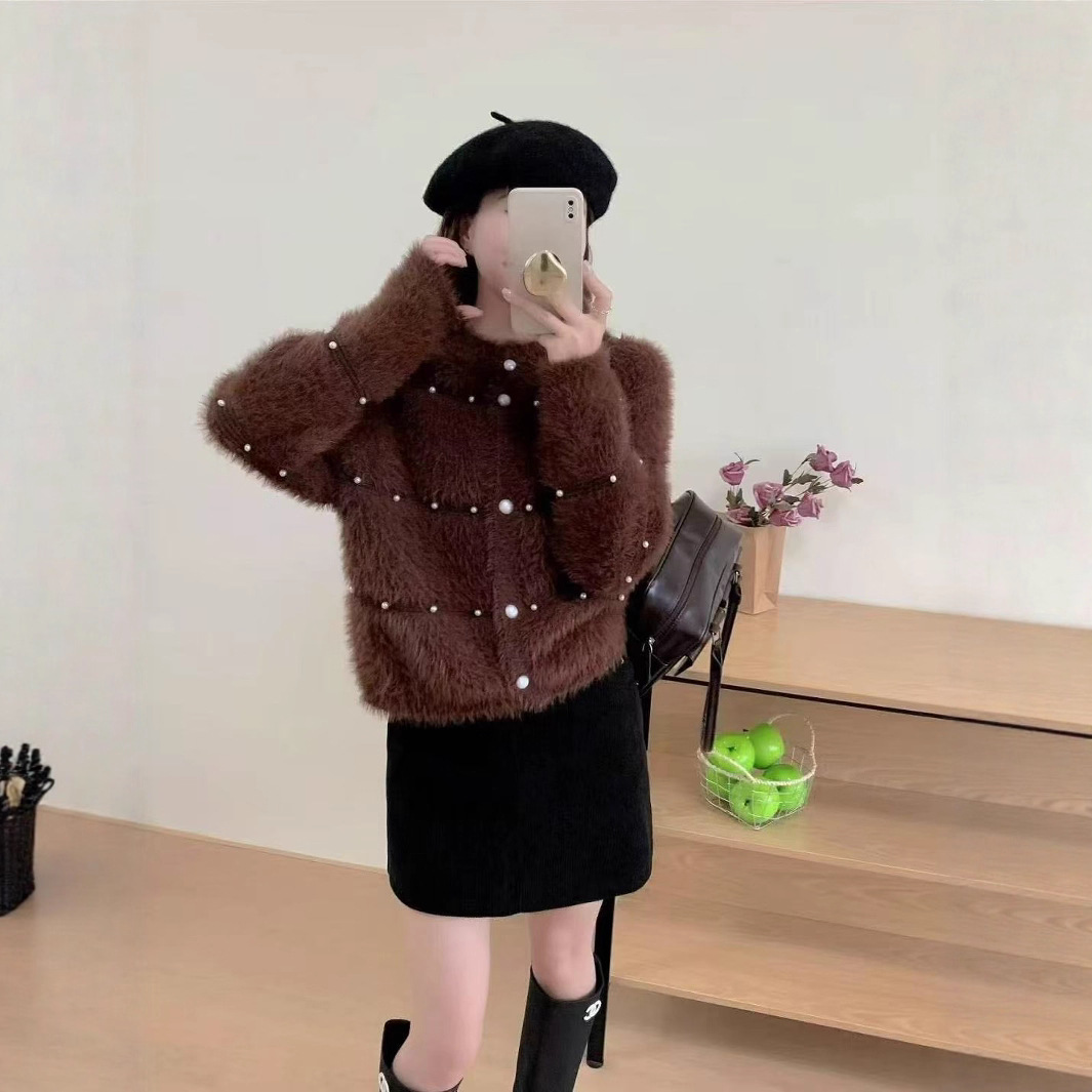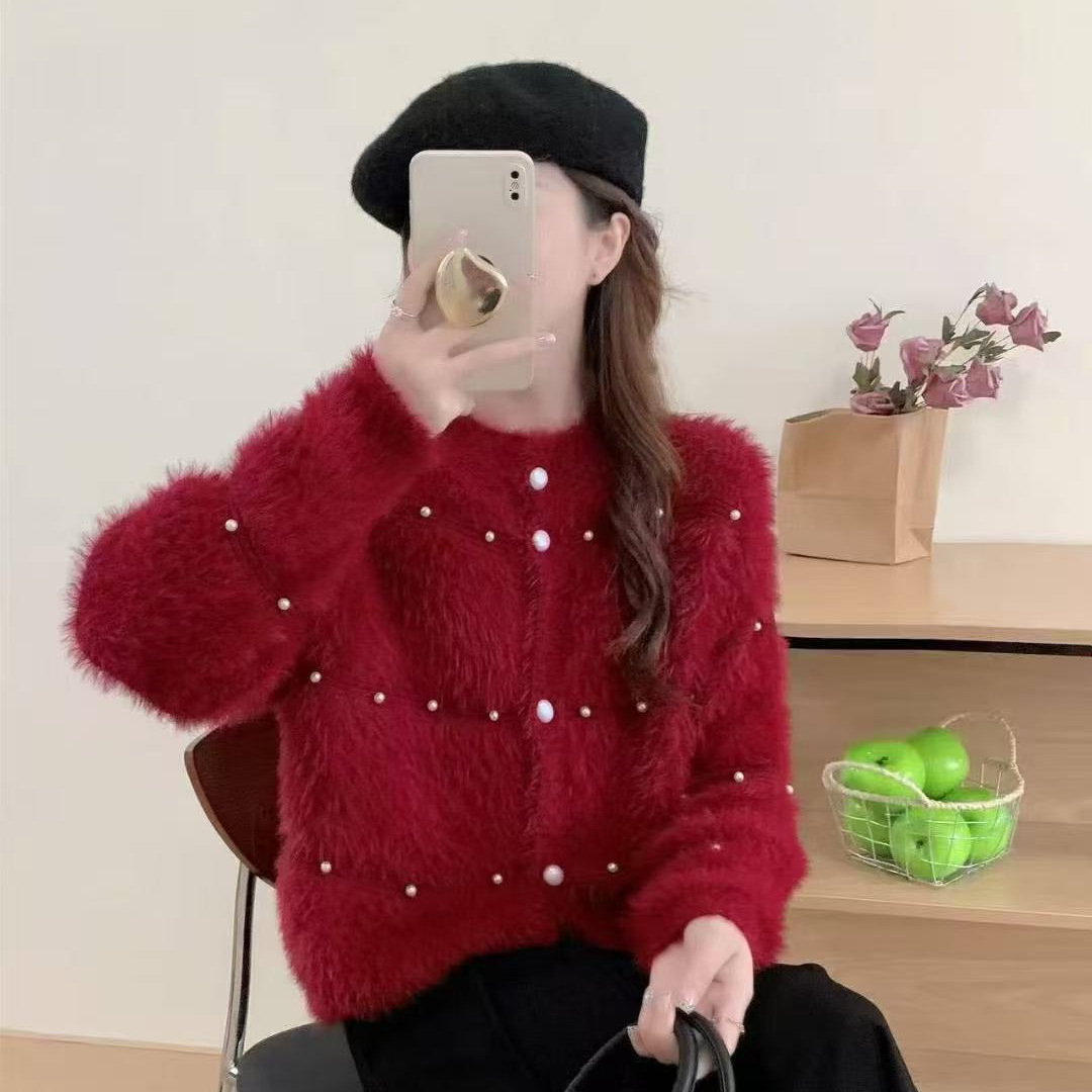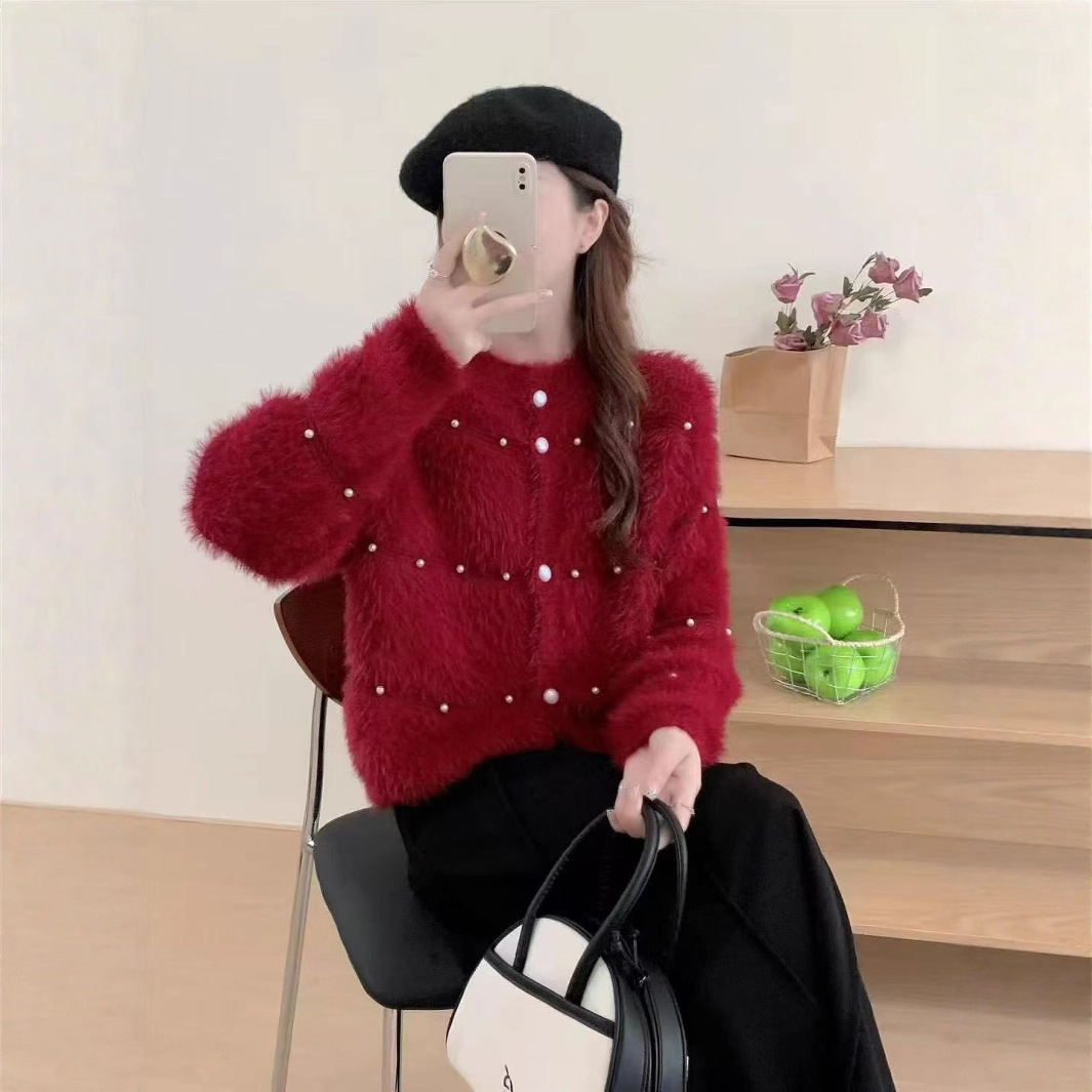 Твидовый вязаный кардиган для женщин, осень-зима 2025, новый свободный свитер с V-образным вырезом, украшенный бисером, имитация норковой куртки