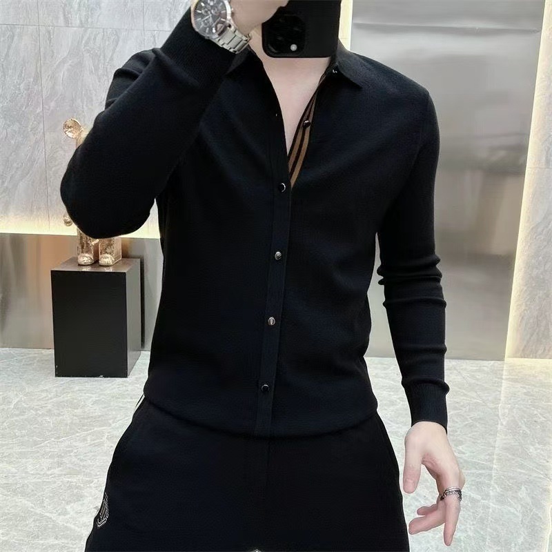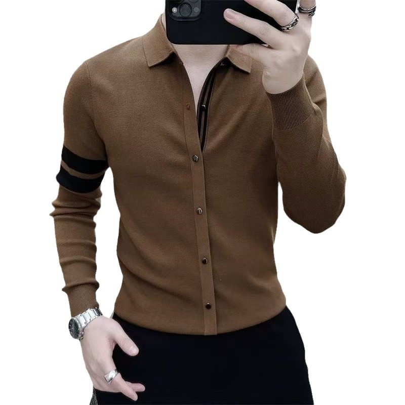 Главная страница > Осенний и зимний сшитый свитер рубашка для мужчин с длинными рукавами новый продвинутый смысл в полоску кардиган на пуговицах трикотажный топ