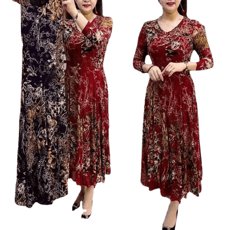 Главная страница > Трансграничное модное материнское платье с v-образным вырезом и цветочным принтом для женщин, ранняя осень, новый стиль, элегантная юбка средней длины с длинными рукавами и талией для похудения