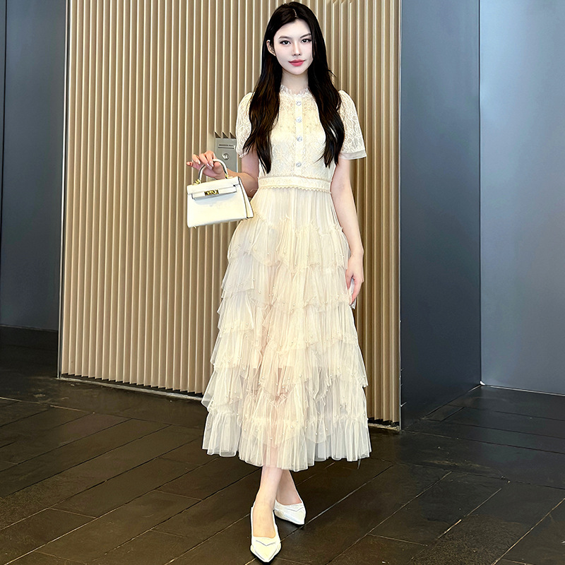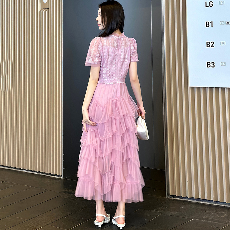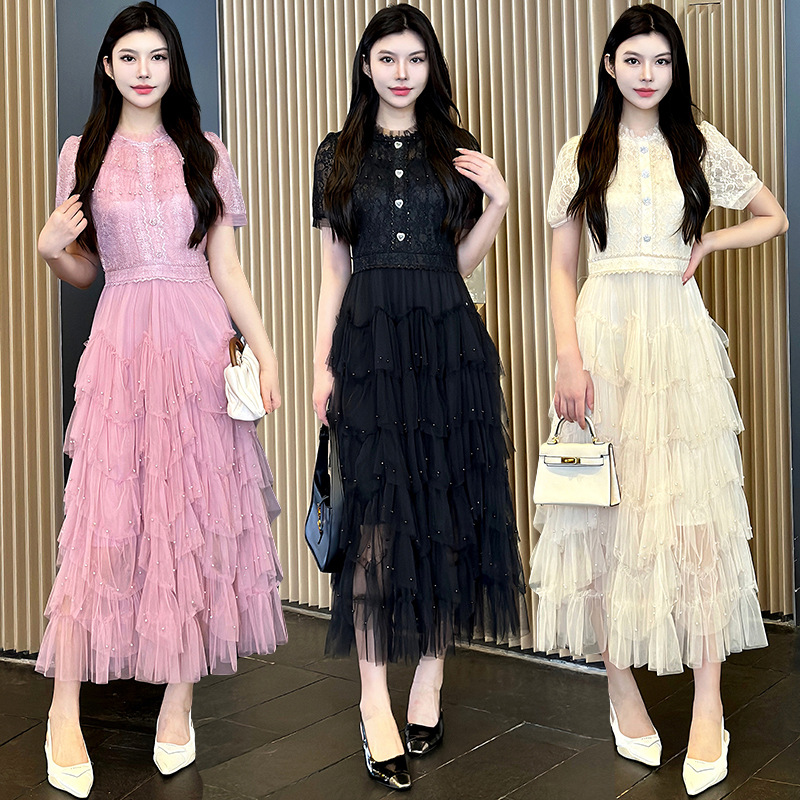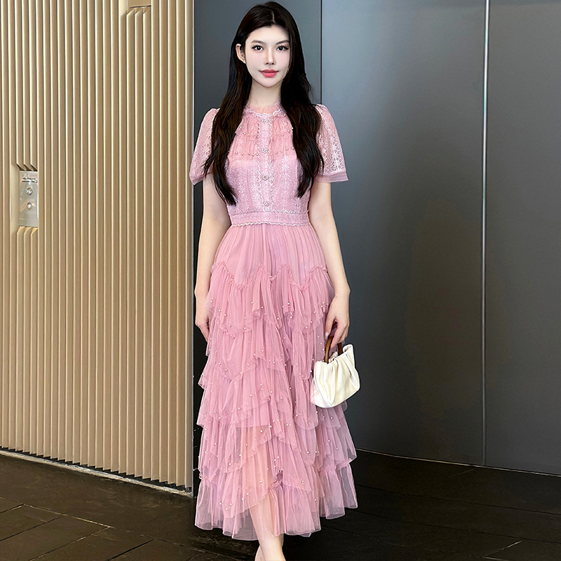 Главная страница > Настоящий выстрел-пятно тяжелого кружева сшивания бисера сетки темперамент фея талия платье розовый черный